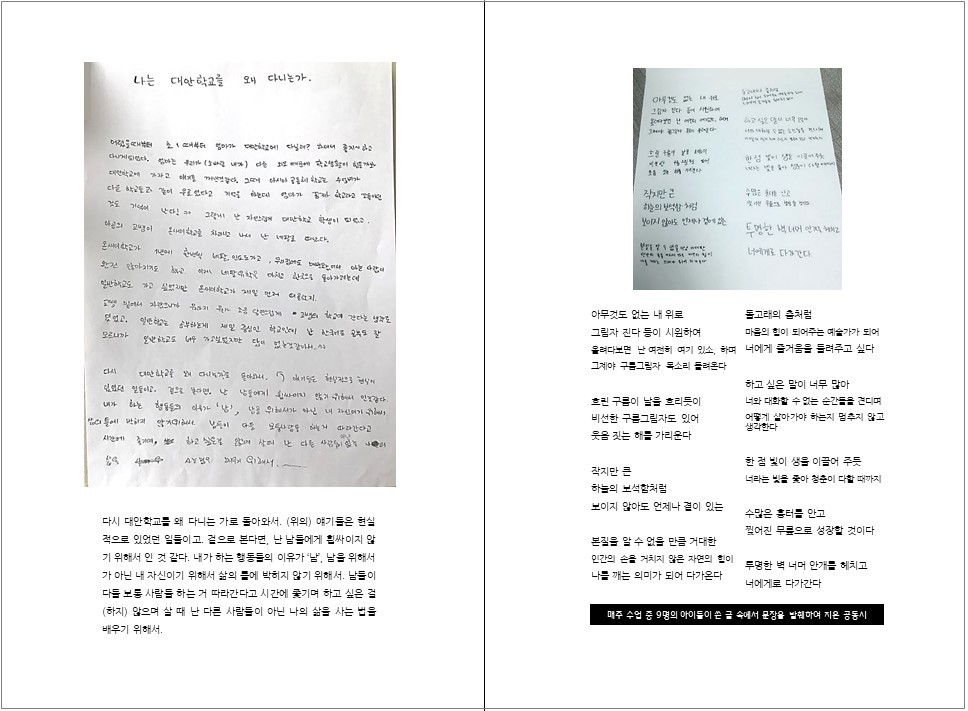그 아이들과의 시간들을 들여다봄으로써 교육 시스템의 모순을 비판적으로 바라보고 청소년들을 발화 주체로 탐구하고자 했습니다.