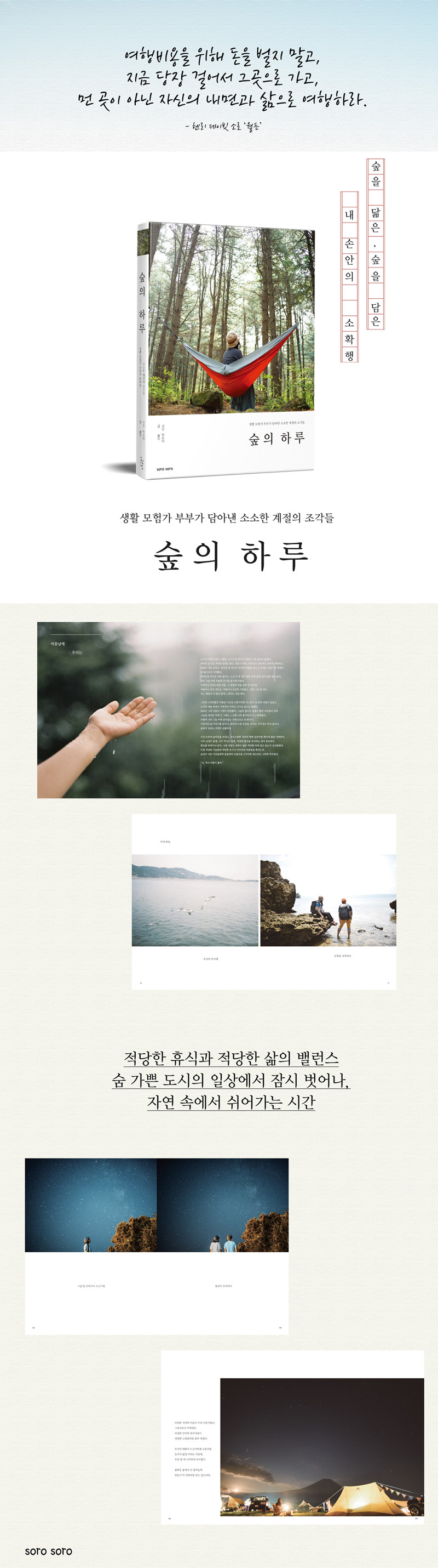 <숲의 하루>는 일상과 여행을 넘나들며 크고 작은 모험을 즐기는 생활 모험가 부부가 만든 감성 포토 에세이이다. 자연 속 생생히 살아있는 계절에서 오롯이 보낸 시간을 사진과 짧은 글로 담아내, 어느 페이지를 펼쳐도 편안하게 읽을 수 있는 책 <숲의 하루>.
