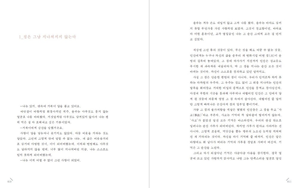 -음식을 먹다가 가시가 목에 걸렸다 생각하는 순간은 대부분 착각이래. 가시가 스쳐간 상처가 아직 쓰려서 그걸 가시라고 착각하는 거야. -이미 가시는 지나갔어. 나는 고개를 끄덕였다. 그러지 않고는 울 것 같았다.