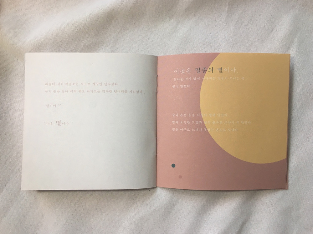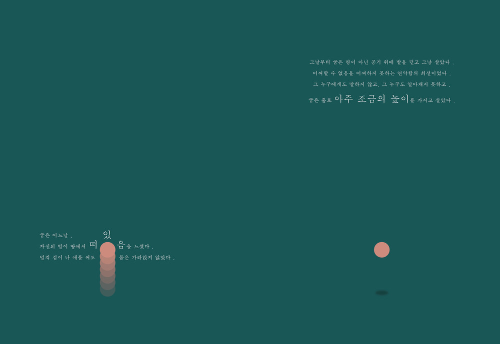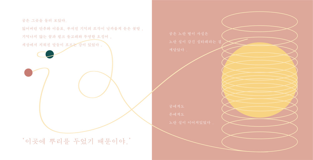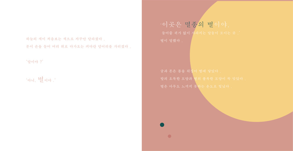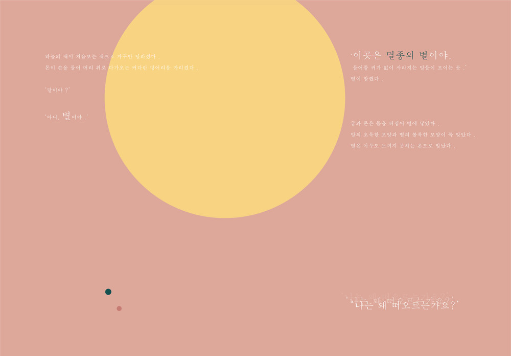 ‘이곳은 멸종의 별이야. 들어줄 귀가 없이 사라지는 말들이 모이는 곳.’ 별이 말했다. 굼과 몬은 몸을 뒤집어 별에 닿았다. 발의 오목한 모양과 별의 볼록한 모양이 꼭 맞았다. 별은 아무도 느끼지 못하는 온도로 빛났다. ‘나는 왜 떠오르는가요?’ . . ‘이곳에 뿌리를 두었기 때문이야.’