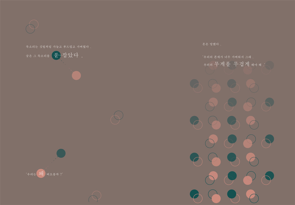 모든 점들은 공의 상태로 다시 돌아가 태초의 태동을 했다. 다시 상처받고 다시 싸워야하는 날들이 반복된대도 완전히 죽지 않음에 의미있는 것이었다. 정말로 돌아간 것이 아니라 나아간 흔적을 남기는 일들이었다, 고 생각했다.