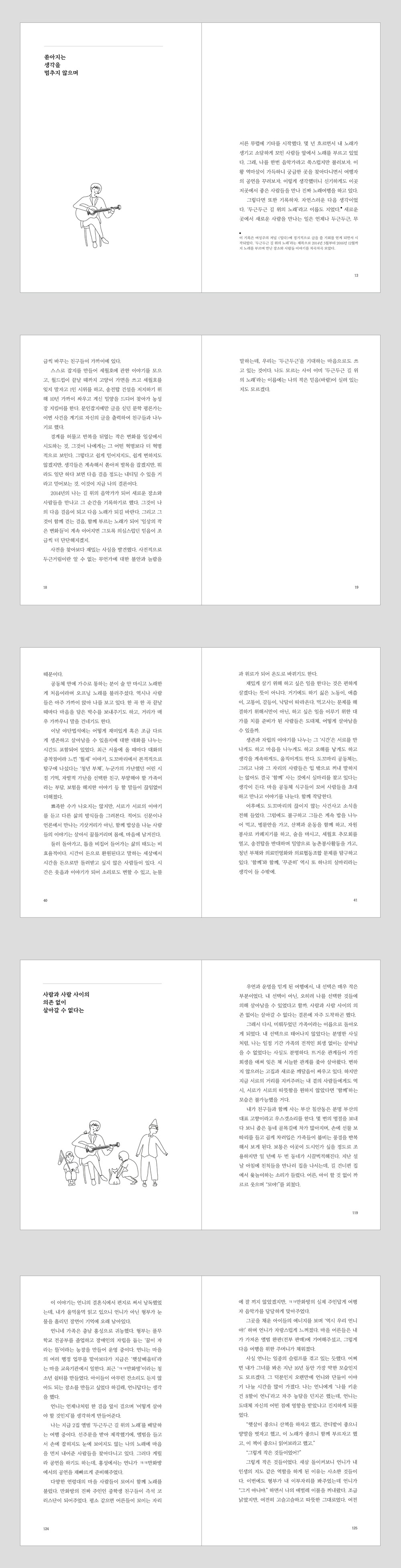 책임을 묻고 물으며 사건에 대한 ‘대안’과 ‘결과’에 집중하게 되면 약한 한 사람으로서는 감당할 수 없는 무력감이 찾아온다. 적어도 나는 그렇다. 강해지고 싶긴 하지만 한 번도 강했던 적은 없는 나 같은 사람에게 결국 내 자리에서 내가 취할 태도를 돌아보라는, 그러면 충분히 움직일 수 있다는 토닥임 같았다. 내 자리에서, 진지하게, 할 수 있는 만큼, 기억하기 위해, 즐겁게, 아프게, 아름답게, 가끔이라도, 혹은 자주, 강렬하게, 조용하게, 잔잔하게, 꾸준하게, 함께.... -55P