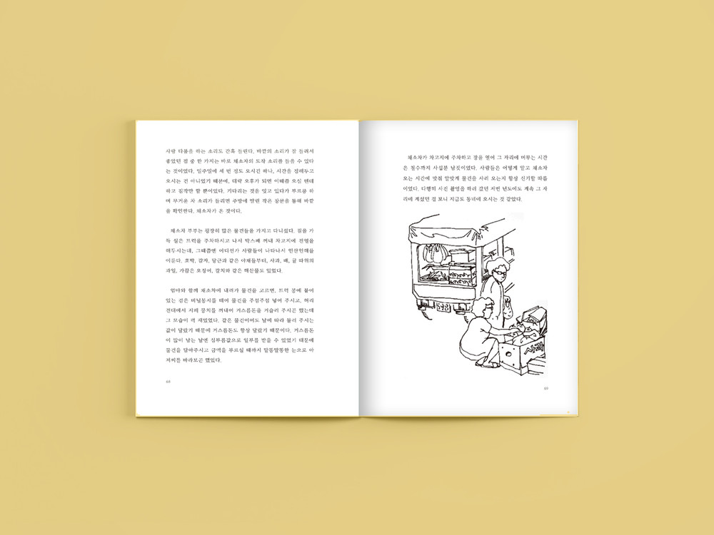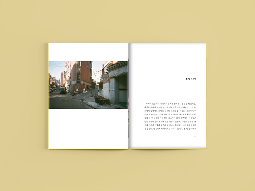 책에는 어린 시절부터 동네를 떠나 이사를 가기 전까지의 추억을 현재 모습 사진과, 과거의 그 자리에 있던 모습 드로잉과 함께 담겨져 있습니다.