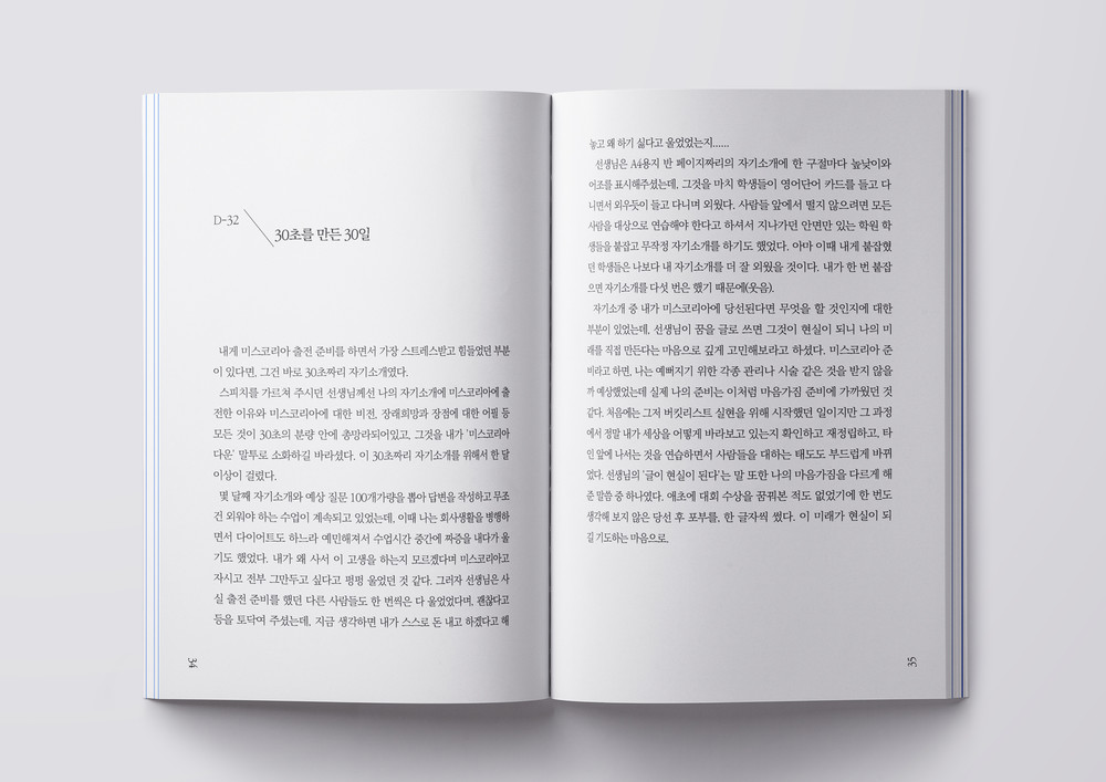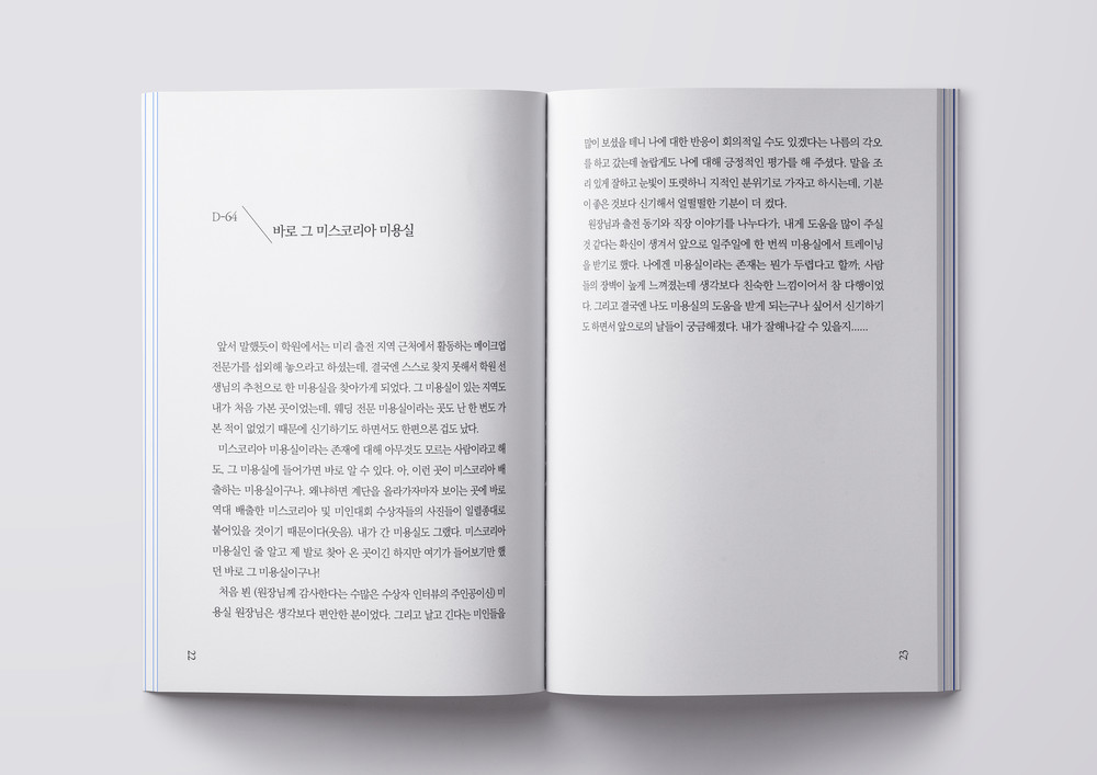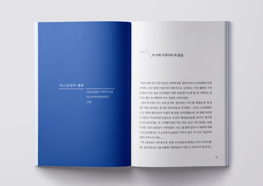 하지만 일반적으로 미스코리아에 대한 책이나 기사는 수상자들의 화려한 인터뷰들, 혹은 미스코리아에 대한 비판이 대부분이었습니다.