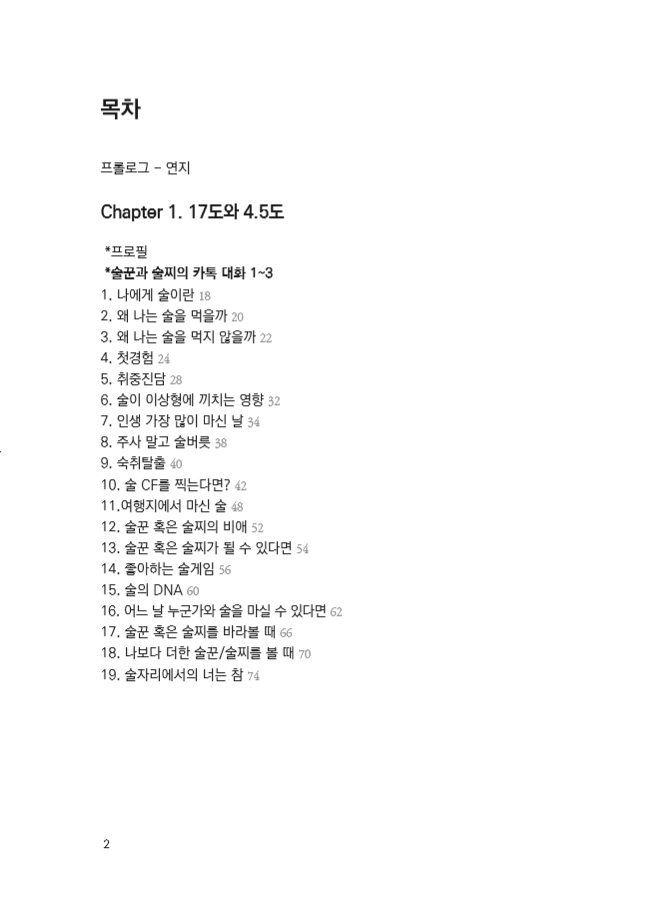 17도의 소주를 연거푸 마셔야 취하는 술꾼 희영, 4.5도의 맥주 한잔에도 비틀대는 술찌(술 찌질이) 연지. 술꾼의 기준은 주량이 아니라 술에 대한 애정도라 생각하는 희영, 술 안 좋아하고 못 마시지만 술자리에 안 가지는 않는 연지. 두 여자가 서로의 도수를 이해하고 싶은 마음으로 쓴 술 이야기입니다. 술이라는 같은 주제로 다른 이야기를 하고, 의외로 같은 이야기를 하기도 하며, 이제껏 나누었던 의미있는 대화를 정리했습니다.