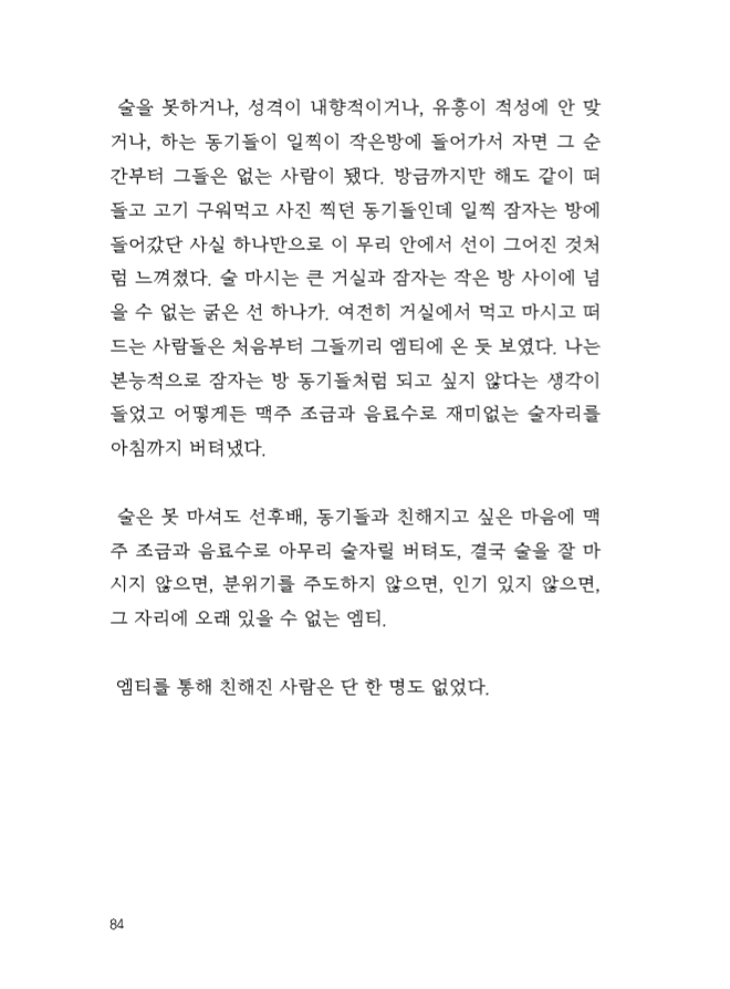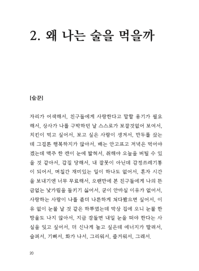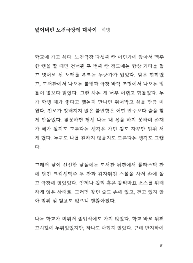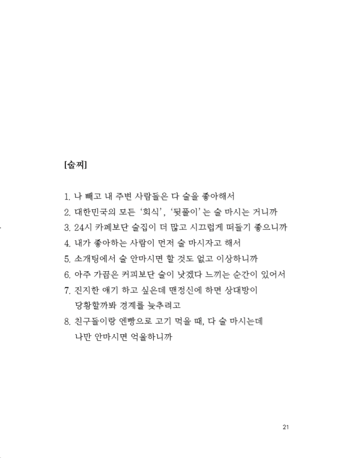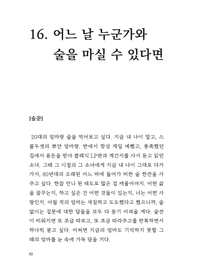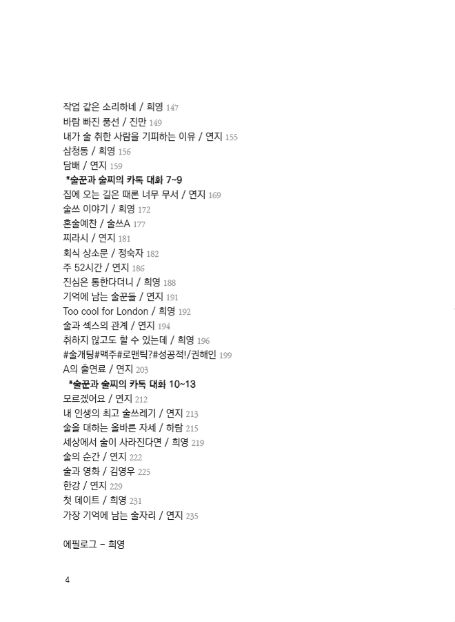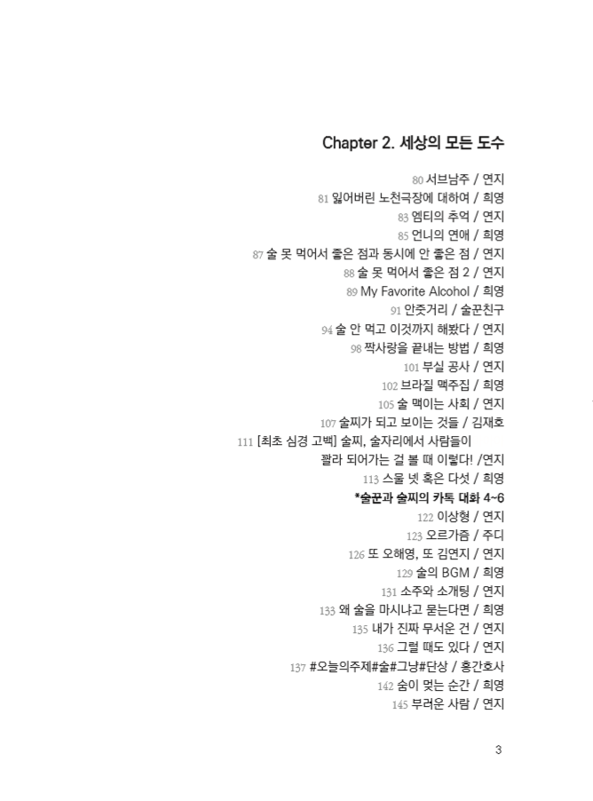 이 책은 읽는 당신의 도수에 따라 소주 맛이 더 나는 책일 수도, 맥주 맛이 더 나는 책일 수도 있습니다. 물론 절묘한 황금비율의 조합으로 ‘오, 어떻게 이런 맛이!’ 하는 맛있는 소맥이면 좋겠다는 욕심도 가져봅니다.