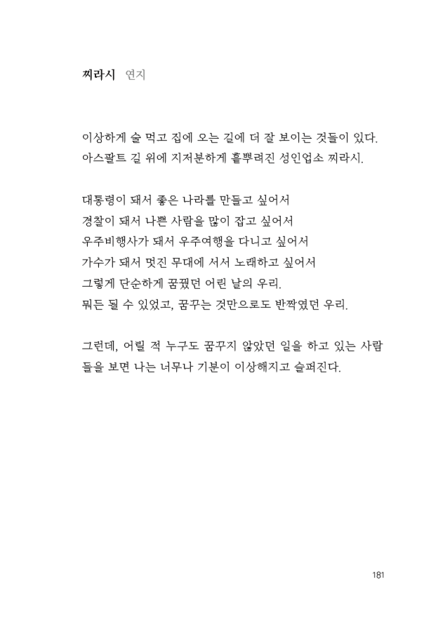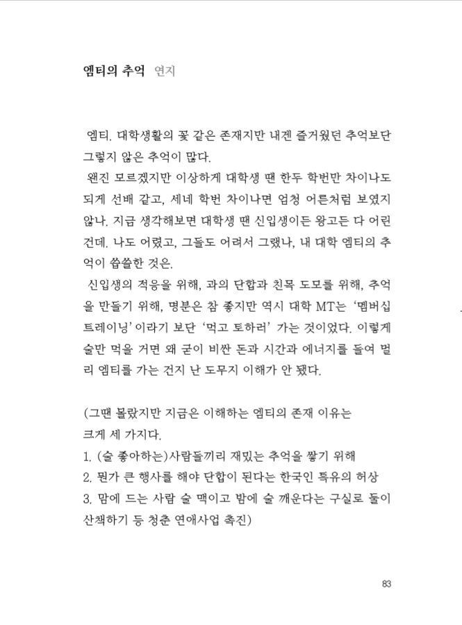 취업만 보고 대학생활을 달린 끝에 스물셋에 덜컥 입사, 지금은 5년차 대리입니다. 읽는 거라곤 보고서와 메일이 다라서 일상의 단어를 잃어가고 있던 차에 연지언니를 만나 하나씩 되찾고 있습니다.인생의 낙은 술과 노랜데 술먹고 노래방은 싫습니다. 술 없이 족발을, 떡볶이를, 김치찌개를 어떻게 먹어야하는지 알 수가 없을 따름입니다.