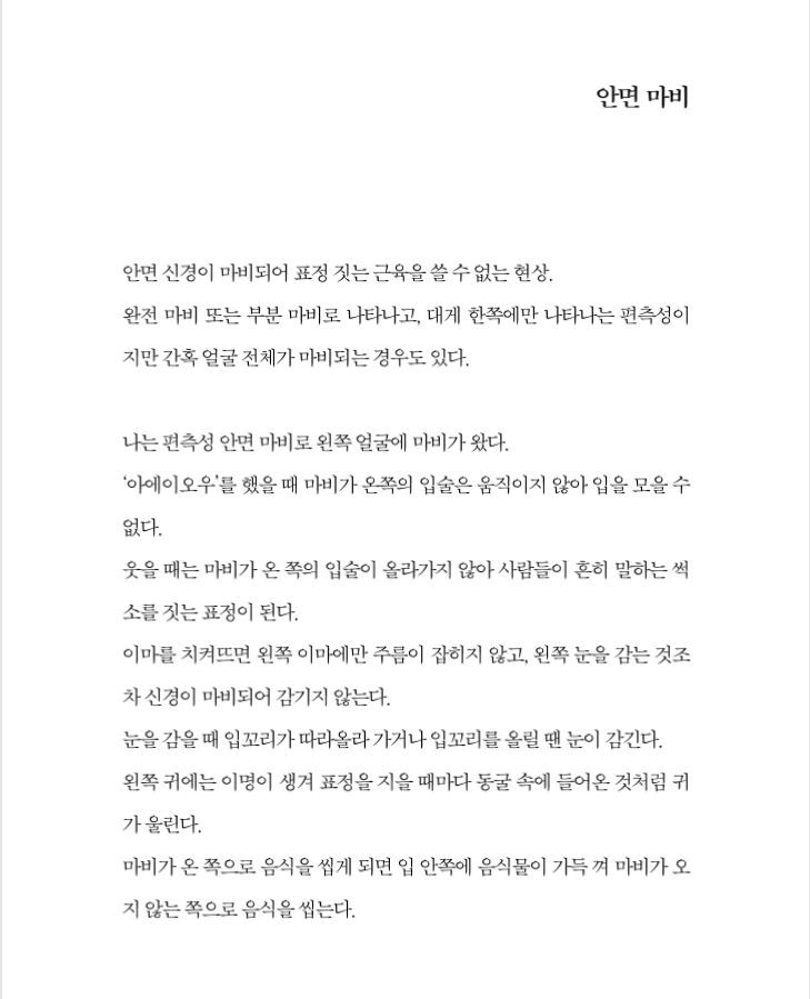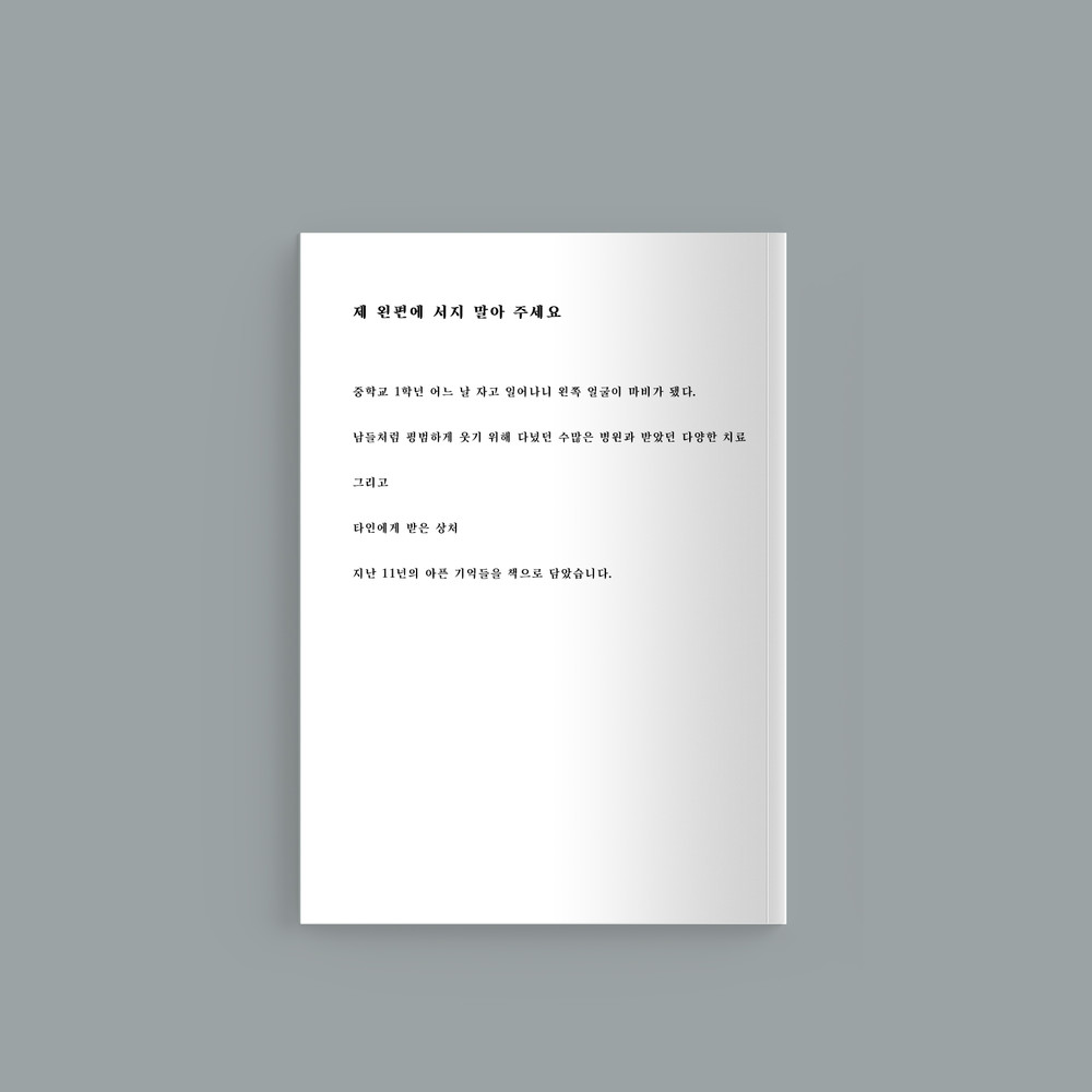 중학교 1학년, 지금으로 부터 11년 전 어느날 갑자기 자고 일어났더니 왼쪽 얼굴이 마비가 됐습니다. 남들처럼 평범하게 웃기 위해 다녔던 수많은 병원들, 받았던 다양한 치료들. 그리고 타인에게 받은 상처. 지난 11년의 아픈 기억들을 책으로 담았습니다. 저는 현재도 완치 되지 못한 채 살아가고 있습니다.