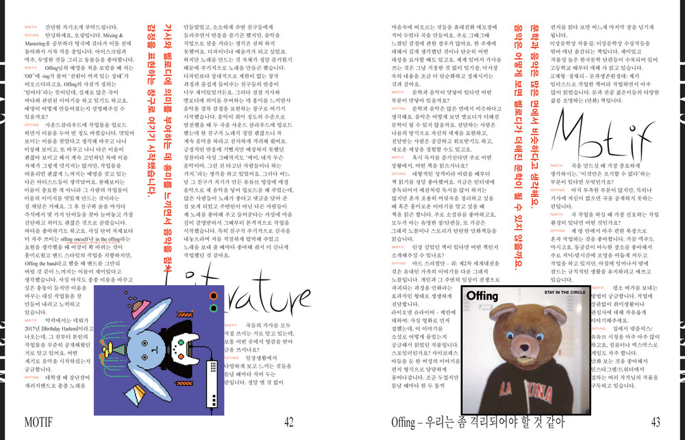 다양한 아티스트와의 대담을 통해, 그들의 예술 속에서 모티프를 만날 수 있는 <Motif Story>에는 신예 싱어송라이터 "Offing"의 인터뷰가 게재된다.