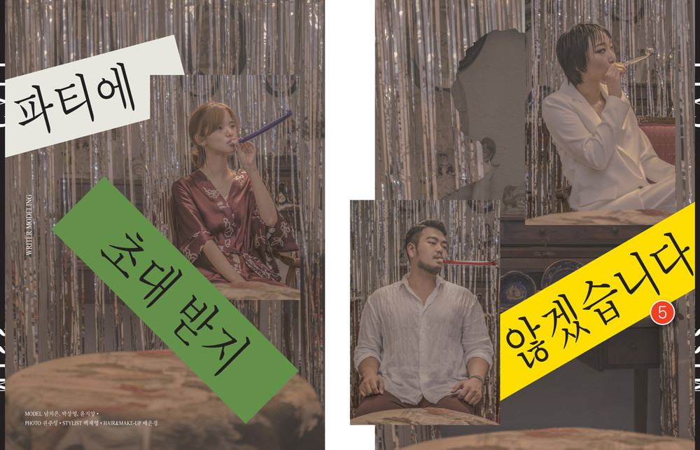 <Writers Modeling>에서는 박상영 소설가, 남지은 시인, 윤지양 시인의 신작들이 게재된다. 세 명의 작가들이 직접 모델이 되어 패션 화보를 촬영하였다. 비가 쏟아지는 날 열린 그들만의 파티에 함께 참석해보는 것을 추천한다.