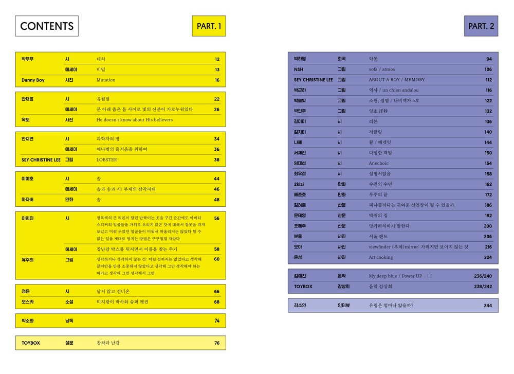 그래서 한번 움직여보기로 했습니다. 직접 놀이터를 열어보기로 했습니다. 지면을 열고 함께 하고 싶은 사람들을 초대하기로 했습니다. 장르, 등단 여부, 활동 경력 등 아무것에도 구애받지 않고 함께 놀고 싶은 마음들을 모았습니다. 장난감(感)을 모으듯 ‘토이박스’를 마련해보았습니다.