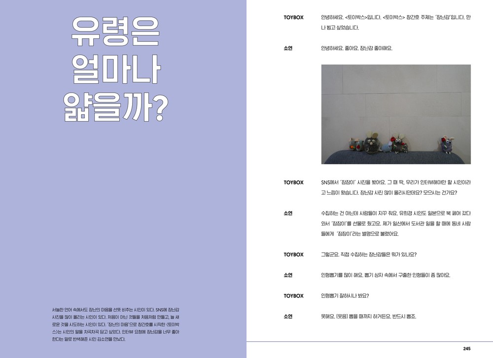 〈토이박스〉 VOL.1의 주제는 '장난-감(感): 장난하는 마음'입니다. 〈토이박스〉 VOL.1 '장난-감(感)'은 첫 호답게, 장난과 창작의 시작, 장난하는 마음을 주제로 즐거움을 탐방하는 여정을 시작합니다. 장난의 밝고 어두운, 얇고 깊은 모양들을 살펴 갑니다. '장난-감(感): 장난하는 마음'으로 함께 떠나요. 함께 놀아요.
