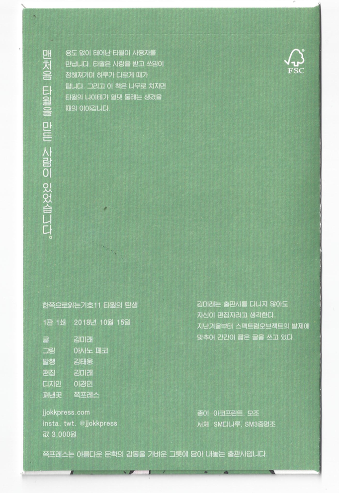 김미래는 출판사를 다니지 않아도 자신이 편집자라고 생각한다. 지난겨울부터 스펙트럼오브젝트의 발제에 맞추어 간간이 짧은 글을 쓰고 있다. 용도 없이 태어난 타월이 사용자를 만납니다. 타월은 사랑을 받고 쓰임이 정해져가며 하루가 다르게 때가 탑니다. 그리고 이 책은 나무로 치자면 타월의 나이테가 열댓 둘레는 생겼을 때의 이야깁니다.