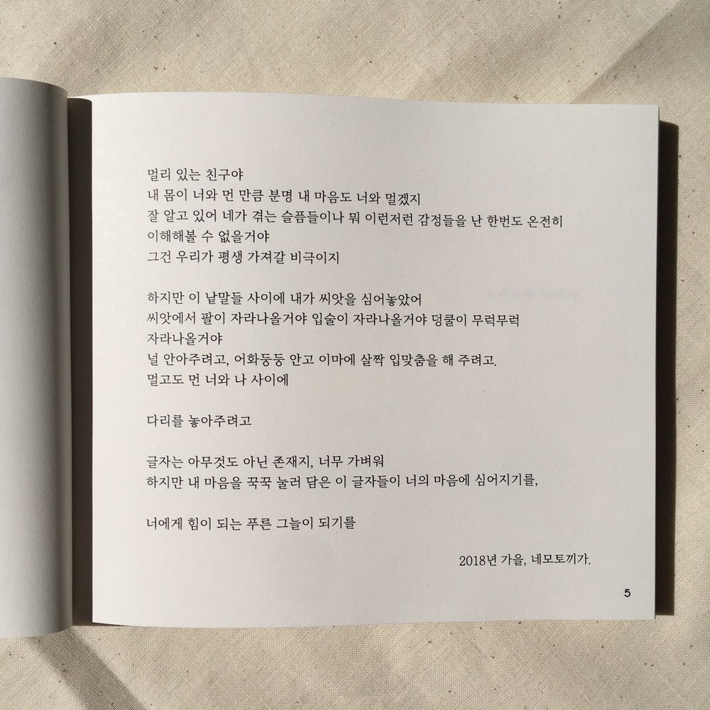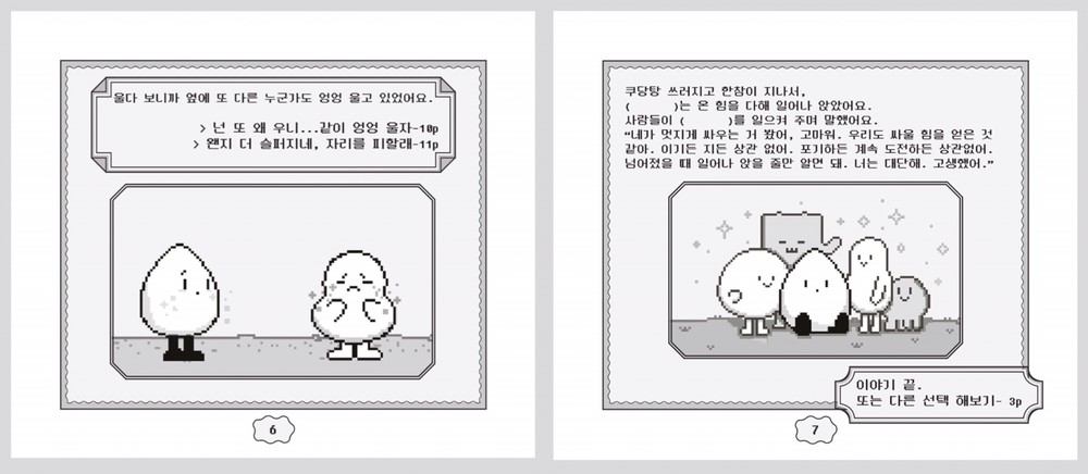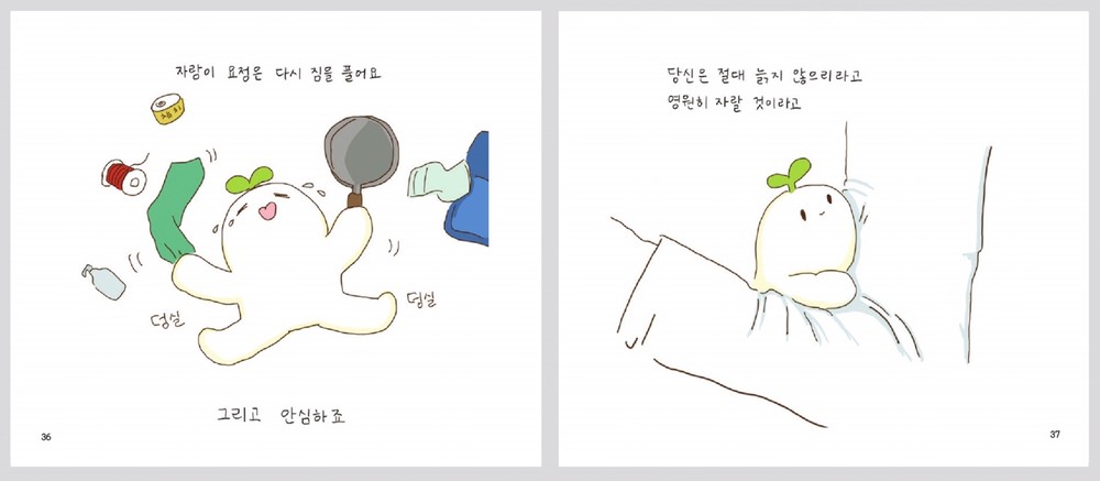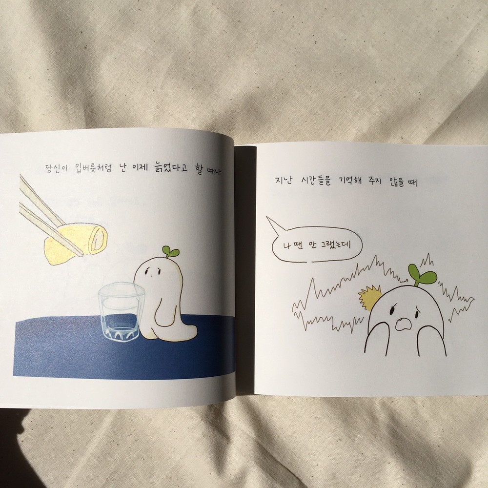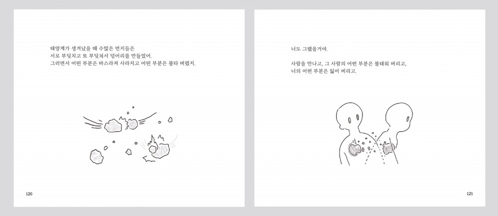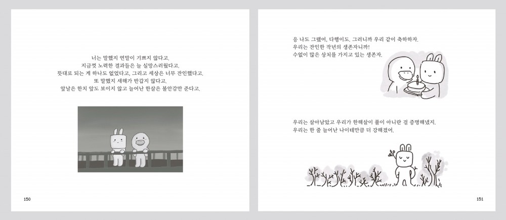 그런데 이야기를 쓰다 보면 제가 만들어낸 친구들은 이겨내거나 지는 것엔 상관하지 않고 이야기를 끝내곤 했습니다. 춤을 추거나 꽃을 피우거나 하면서요. 뭘 하며 어떤 일을 겪든 다들 '삶'이라는 가장 큰 선물이자 적을 이겨내고 있었으니까요.