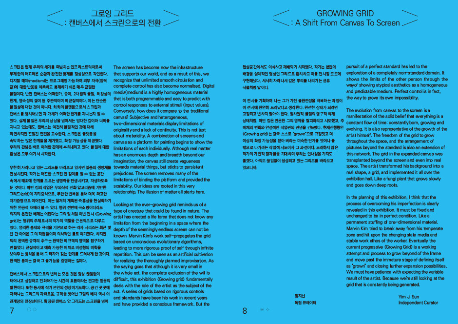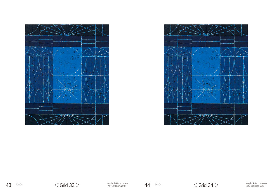 전시전경, 그리드 연작과 관련된 페인팅 / 목판화 / 스케치 원본 등과 작품에 대한 글 및 작가와의 인터뷰가 실려있습니다.