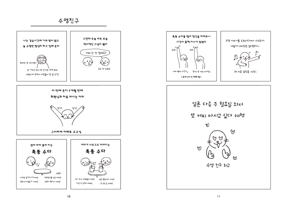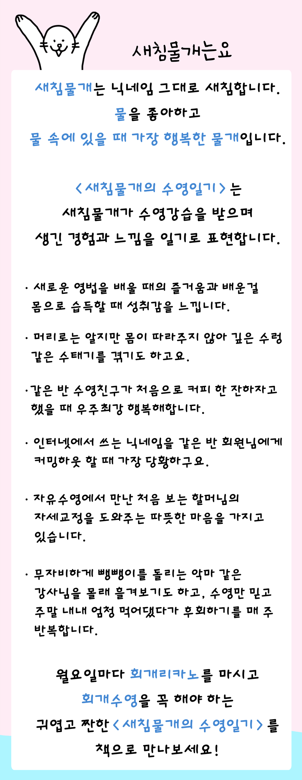 <새침물개의 수영일기>에는 월요일마다 회개수영을 하고 회개리카노를 마시는 귀엽고 짠한 새침물개의 수영라이프가 담겨있어요.