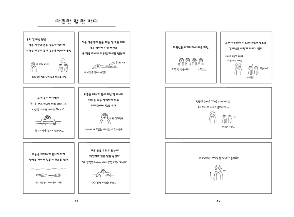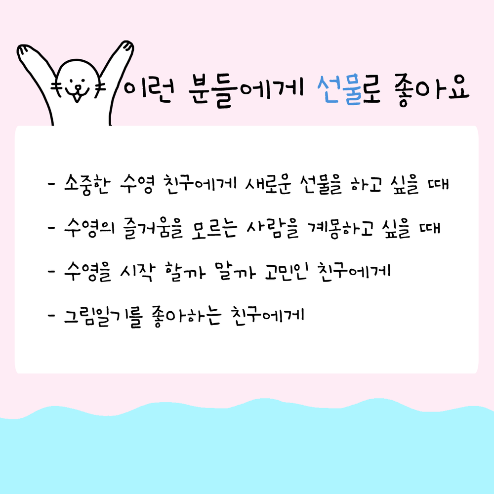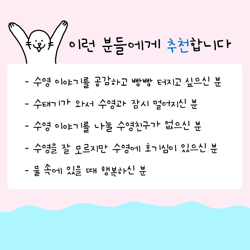 우연히 <나 혼자 산다>에서 배우 성훈씨가 수영하는 모습을 보고 수영강습을 시작했습니다. 더 많은 사람들과 수영이야기를 나누고 싶어 수영일기를 그리고 있습니다.