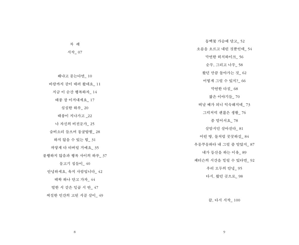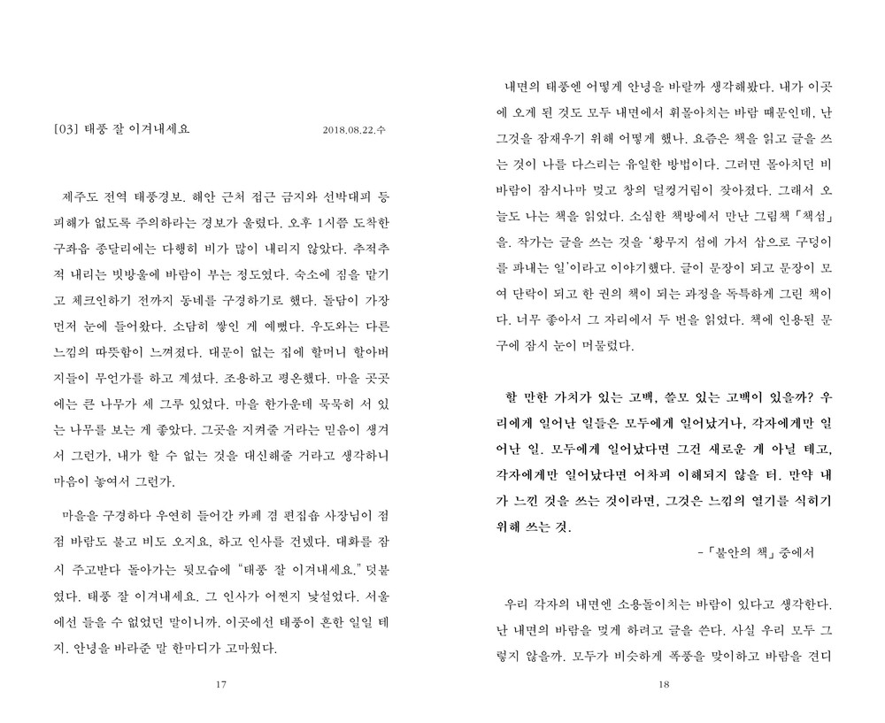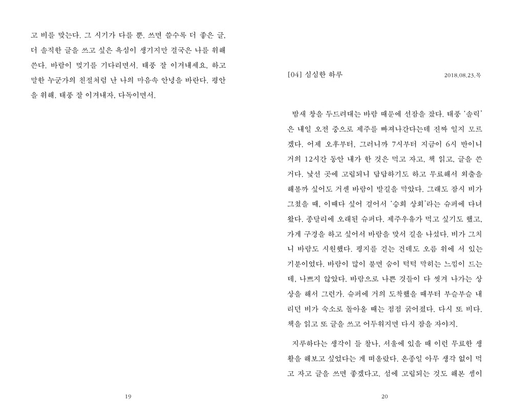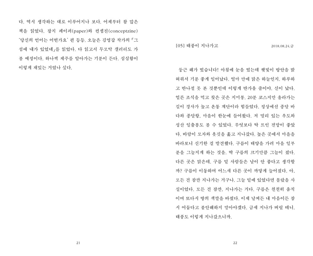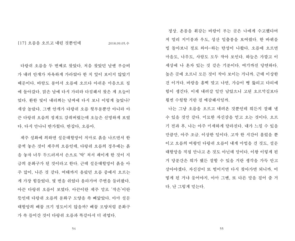 해와 달, 낙조와 별이 살아 숨 쉴 거다. 떠난 곳과 도착한 곳이 같지만 내 삶은 분명 달라질 것이고 나는 그것을 온전히 느끼며 살아갈 것이다.