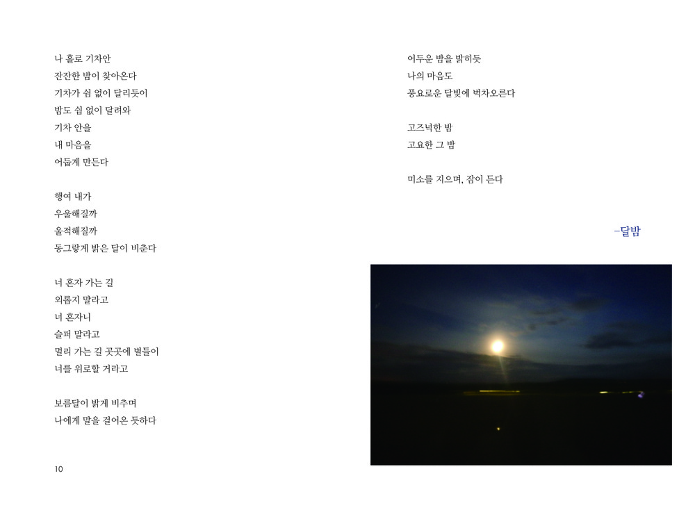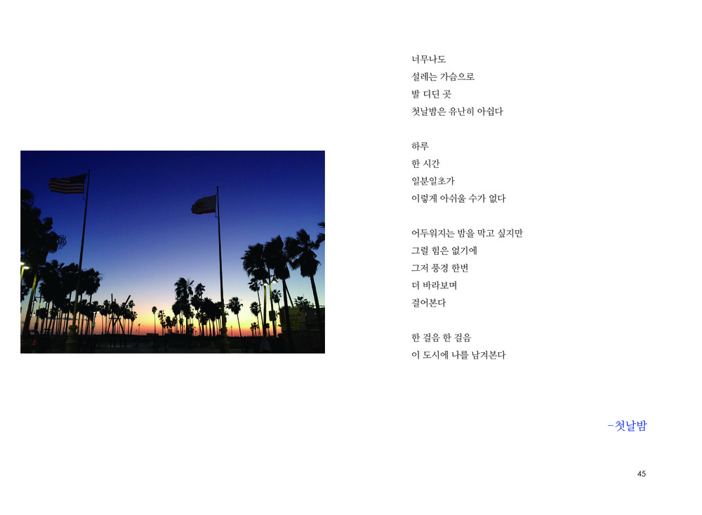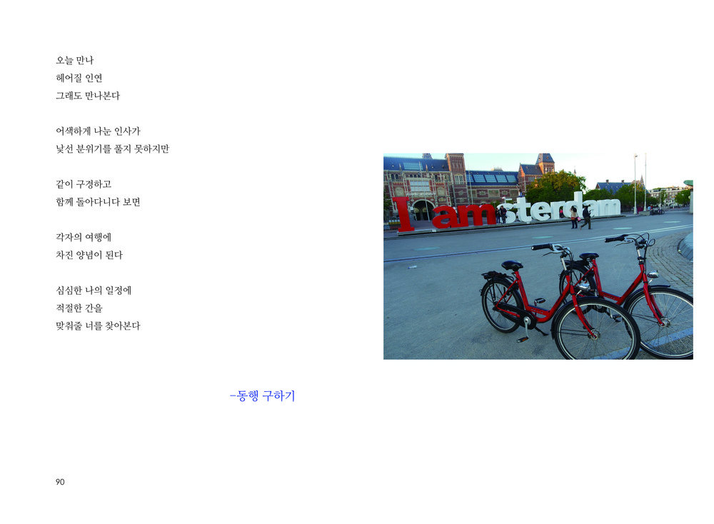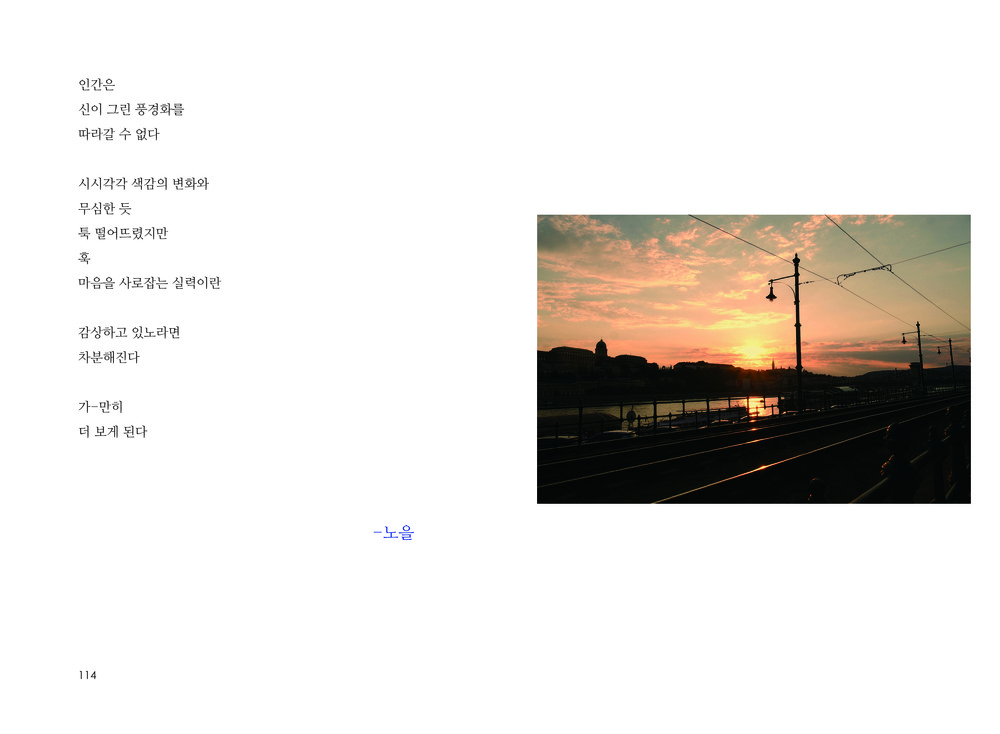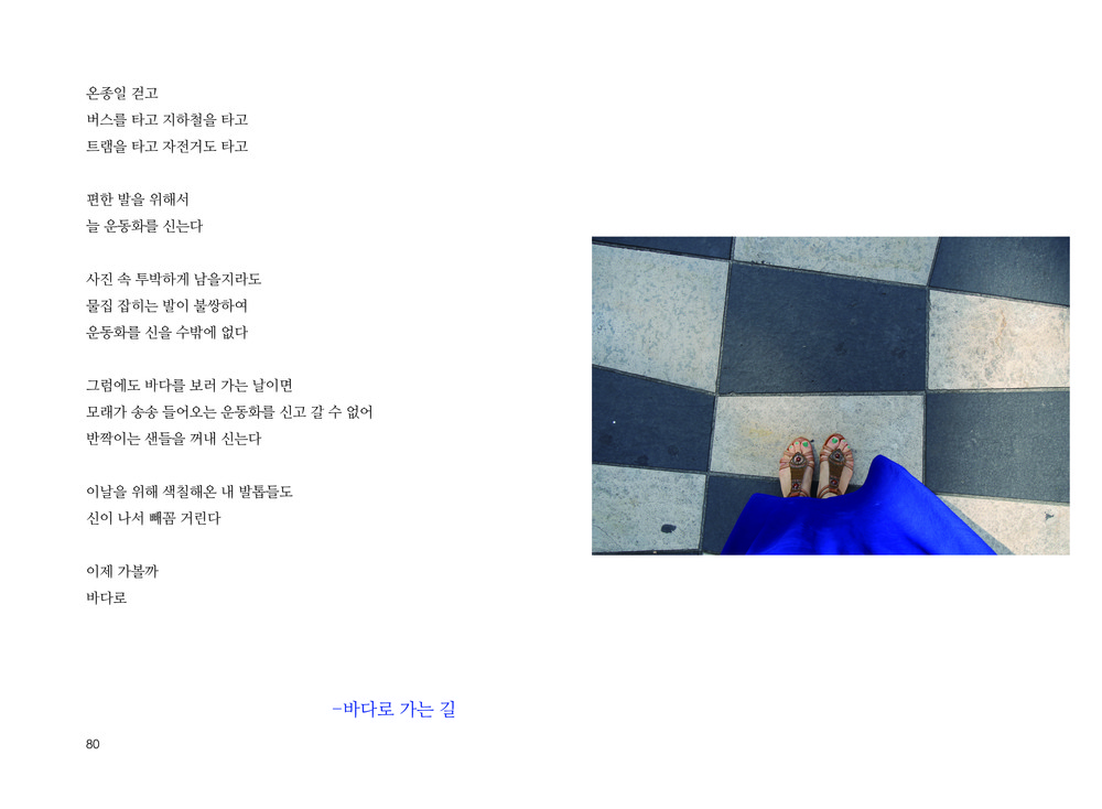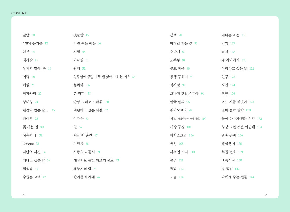 PROLOGUE / 달밤 / 4월의 봄겨울 / 안부 / 옛사랑 / 놓치지 말아, 봄 / 여명 / 이별 / 창가자리 / 상대성 / 괜찮지 않은 날 Ⅰ / 타이밍 / 꽃 사는 길 / 사춘기 Ⅰ / Unique / 나만의 사진 / 떠나고 싶은 날 / 회색빛 / 수줍은 고백 / 첫날밤 / 사진 찍는 이유 / 시험 / 기다림 / 관계 / 일주일에 주말이 두 번 있어야 하는 이유 / 놓치다 / 쓴 커피 / 안녕 그리고 고마워 / 여행 가고 싶은 계절 / 야자수 / 일 / 지금 이 순간 / 기념품 / 사랑의 자물쇠 / 예상치도 못한 위로의 온도 / 휴양지의 힘 / 한여름의 카페 / 선택 / 바다로 가는 길 / 소나기 / 노부부 / 부모 마음 / 동행 구하기 / 짝사랑 / 그나마 괜찮은 하루 / 영국 날씨 / 뛰어오르다 / 사별(사랑하는 이와의 이별) / 시장 구경 / 아이스크림 / 역정 / 사적인 거리 / 물결 / 별밤 / 노을 / 애타는 마음 / 낙엽 / 낙서 / 내 아이에게 / 사랑하고 싶은 날 / 친구 / 사진 / 연인 / 어느 시골 바닷가 / 철이 들락 말락 / 둘이 하나가 되는 시간 / 항상 그런 것은 아닌데 / 결혼 준비 / 월급쟁이 / 복권 번호 / 벼룩시장 / 방 정리 / 나에게 주는 선물 / 욕하고 싶은 날 / 호스텔 / 퇴직 / 빨간불 / 썸 / 나에게도 쉽지 않은 일 / B의 연애 / 엄마의 잔소리 / 핑곗거리 / 동포애 / 잊지마, 너를 위한 일들 / 사춘기Ⅱ / 마약쟁이 / 집안일 / 같은 마음 / 달보드레 / 유기 / 곡절부호^^ / 애매모호 / 충전 / 상처 / 사직서를 품고 사는 자 / 야속한 시간 / 겨울잠 / 가끔은 / 누가 동생이라 할 수 있을까 / 괜찮지 않은 날Ⅱ / 백설 / 선택과 집중 / 너와 나 / 새해 다짐 / 가족 / 감사 / 여행 친구