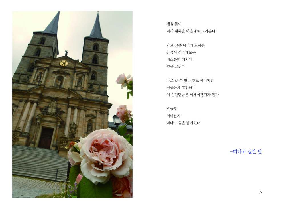 훌쩍 떠나버리고 싶은 독자를 위해 여행지에서의 사진들을 맘껏 골라 담았습니다. 두 달 넘게 유럽을 돌아다니던 시절의 사진들이 대다수이며, 그 후 다른 여행지에서 찍은 사진은 조금 배치되어있습니다. 구체적으로는 유럽(네덜란드, 러시아, 독일, 스위스, 영국, 오스트리아, 체코, 프랑스, 헝가리 등)과 북아메리카에서 찍은 사진과 더불어 동남아 휴양지의 사진도 가끔 있습니다. 배경과 인물에 대한 애정으로 찍은 여행지 사진들은 그와 어울리는 시와 함께 합니다. 100편이 넘는 시와 함께 사진 또한 그만큼 많이 배치하였기에, 일명 ‘글-사진집’ 또는 '시-사진집'이라 소개합니다.