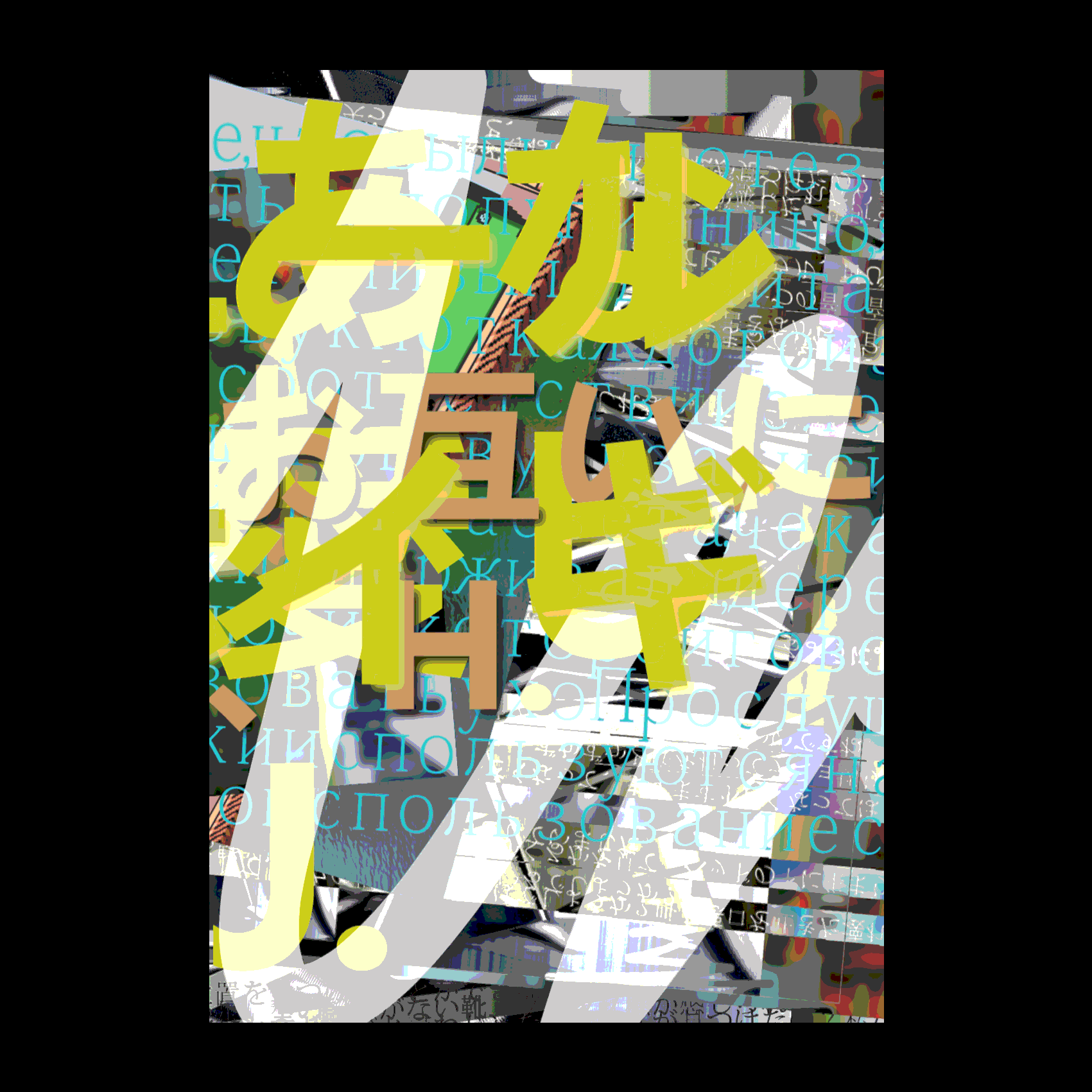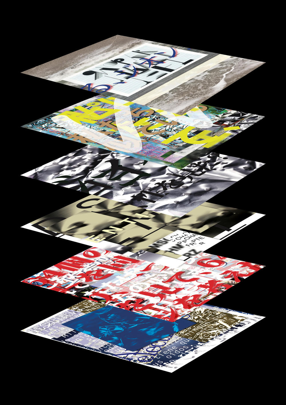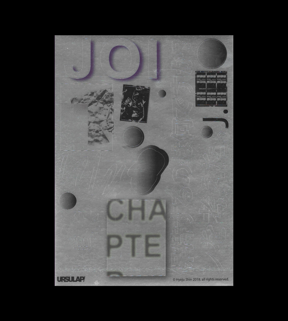 <쿠라이 무리에>는 신혜주 작가가 평소 작업과정에서 나오는 이미지와 텍스트들의 레이어를 쌓아 부서진 언어의 풍경을 연출한 이미지들로, 총 6장 A2 양면 포스터와 은박 스티커 1장으로 구성되어 있다.