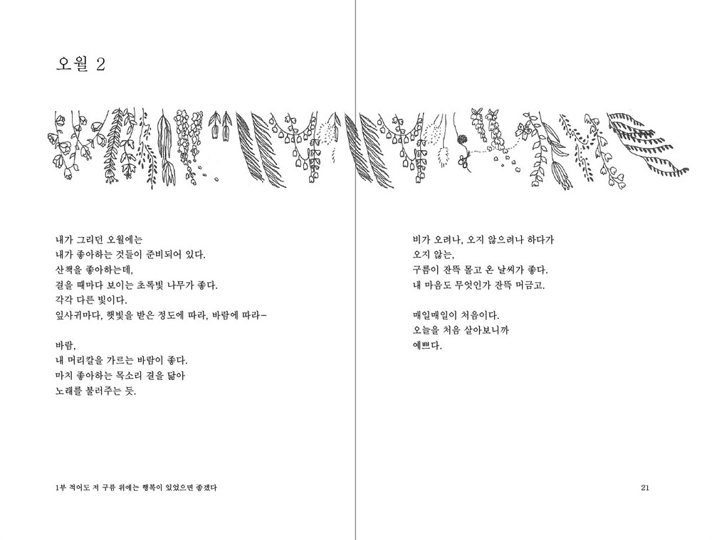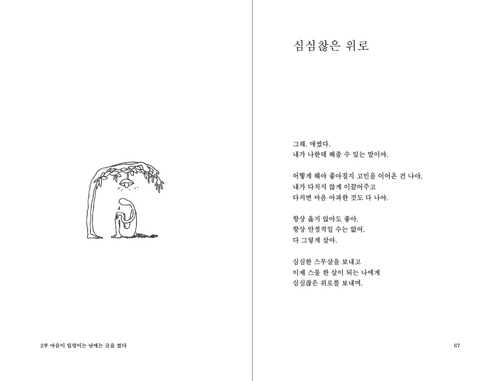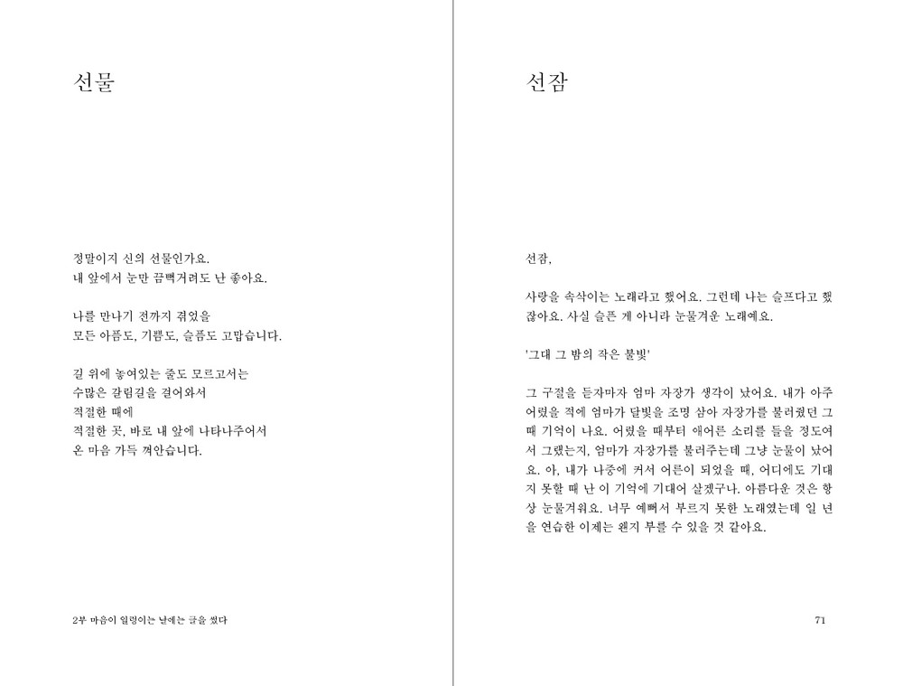 스무 살, 스물 한 살 많은 마음에 흔적을 내었던 그 계절을 종이 위에 펼쳐 곱게 엮은 후 머리 맡에 놓아두기로 했다.