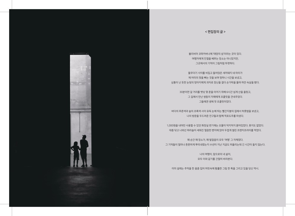 2) 소개글 : '트래쁠'은 여행(TRAvel)과 사람(peoPLE)의 이야기를 담는 여행 매거진입니다. 단순히 '공간의 이동'으로서의 여행이 아닌, 우리네 삶이 여행 그 자체라 여기며 여행에 대한 다양한 이야기들을 나누고 있습니다. 네 명의 편집팀이 매회 각기 다른 에디터들과 함께 작업하여 책을 출간하며, 이번 VOL.2는 총 아홉 분의 에디터가 함께 해주었습니다. 목차에서 확인하실 수 있다시피 여행 정보, 여행 에세이등의 이야기뿐 아니라 음식/그림/타투/문학 등 다양한 관점에서 여행을 '해석'하고 '유희'합니다. 저희 책의 목적은 이처럼 다양한 여행 이야기를 통해 여행자의 '여행 감각'을 간지럽히고, 나아가 '여행에는 어떠한 정답도 없다'는 것을 말하기 위함에 있습니다.