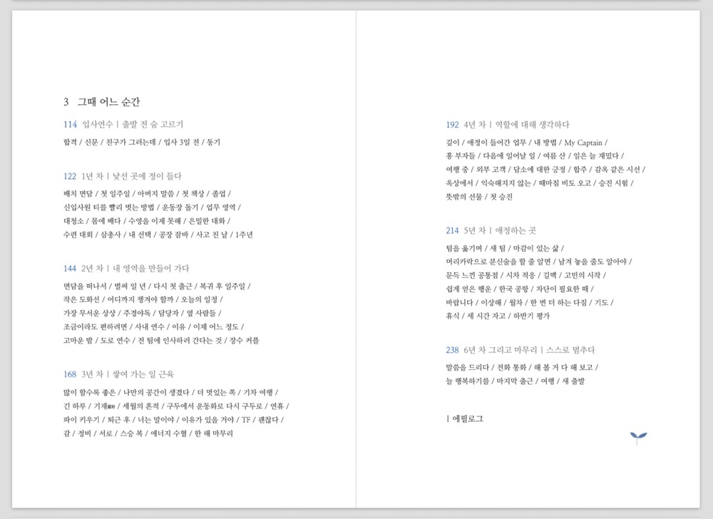배치 면담 / 첫 일주일 / 아버지 말씀 / 첫 책상 / 졸업 /