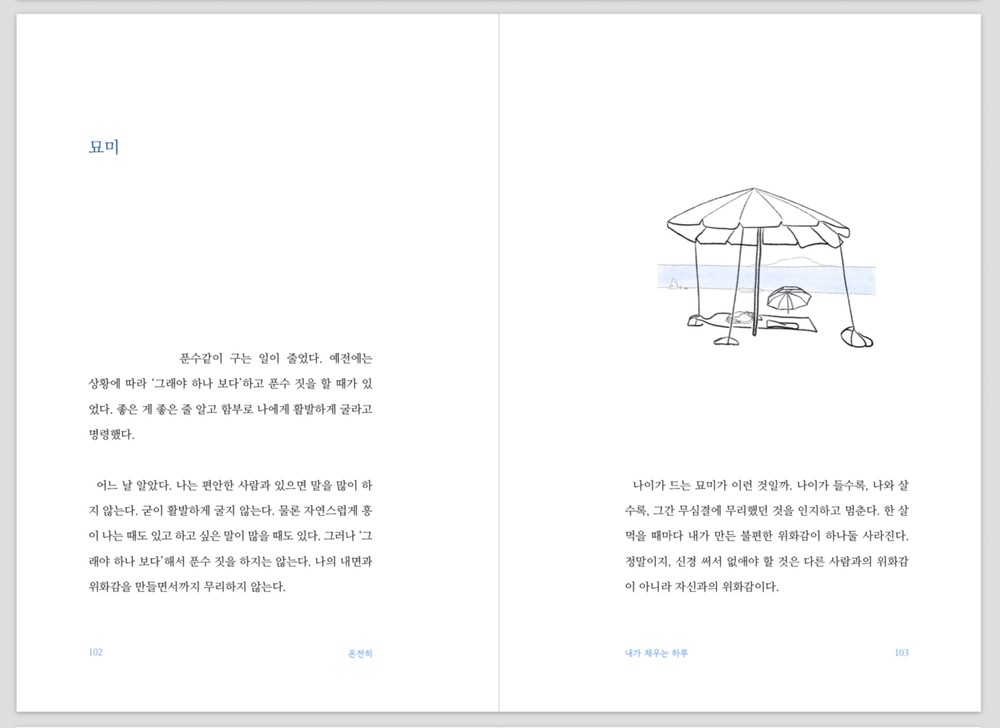 많이 할수록 좋은 / 나만의 공간이 생겼다 / 더 멋있는 쪽 / 기차 여행 / 긴 하루 /