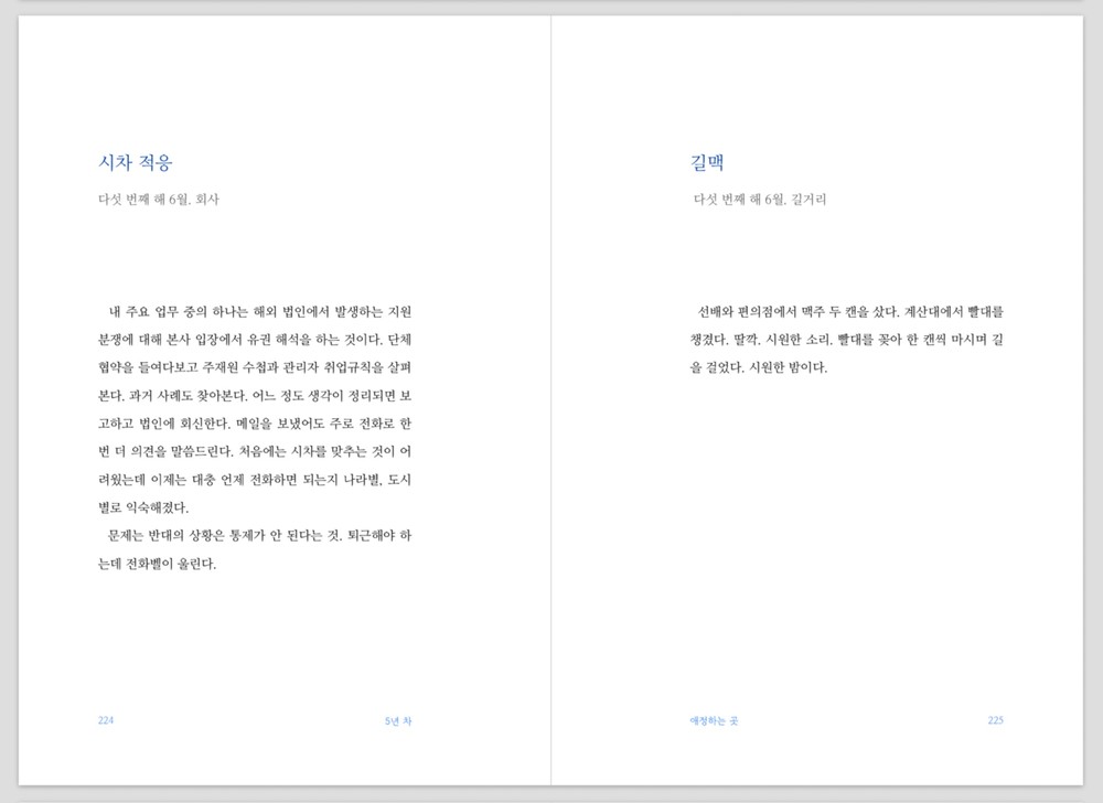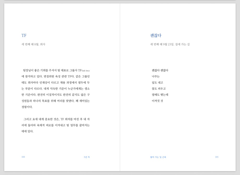 이 책의 전반부가 저자의 퇴사 후 단상을 모아놓은 것이라면, 후반부에는 저자가 직장 생활을 하며 적은 5년 치의 일기가 정리되어 있다. 구체적인 사내 이슈를 배제했음에도 소소한 에피소드와 저자의 생각을 읽고 있노라면, 저자의 밀도있던 회사 생활과 저자가 회사와 일을 어떻게 해석하며 살아왔는지를 온전히 느낄 수 있다. 회사에 막 합격한 시기부터 신입사원 시절, 그리고 일에 대한 자신만의 태도와 가치관을 다져가던 시기, 승진, 그리고 퇴사를 고민하게 되기까지의 일련의 직장 생활이 진솔하게 적혀있다. 저자의 표현처럼 이 일기는, ‘퇴사 후의 삶이 풍요로운 것처럼 퇴사 전의 삶도 아름다웠다는 기록’이다. 저자의 바람처럼 ‘누군가의 두꺼운 일기장을 우연히 주워서 한 장씩 엿보는 기분으로’ 독자가 그녀의 일기를 편하게 읽기를, 그리고 그것이 자발적 멈춤에 대해 생각해 보는 계기가 되기를 바라본다.
