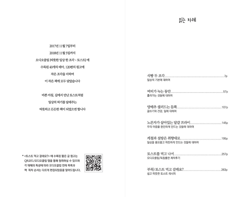 눈이 조금 피로한 날, 책을 읽다가 잠시 사색에 잠기고 싶을 때, 책 속 QR코드로 읽어주는 <토스트 먹고 갈래요?>를 즐겨보세요.