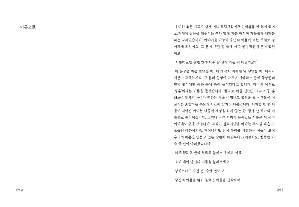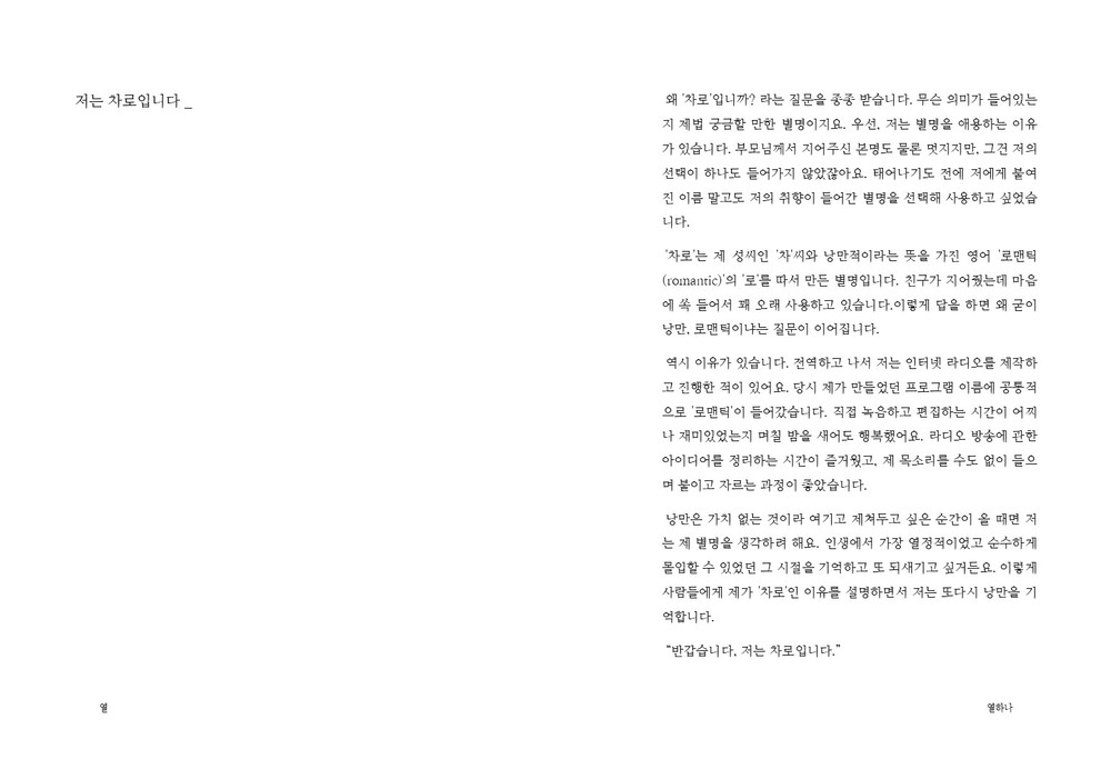 그리고 이 책에는 다양한 이야기들이 담겨 있습니다. 일상에서 벗어난 곳에서 느낀 새로운 감성에 대한 내용부터 소박한 깨달음과 반성의 내용까지. 세상에 대한 저의 시선이 담긴 짧은 글 조각들이 모여 하나의 지점을 관통합니다.
