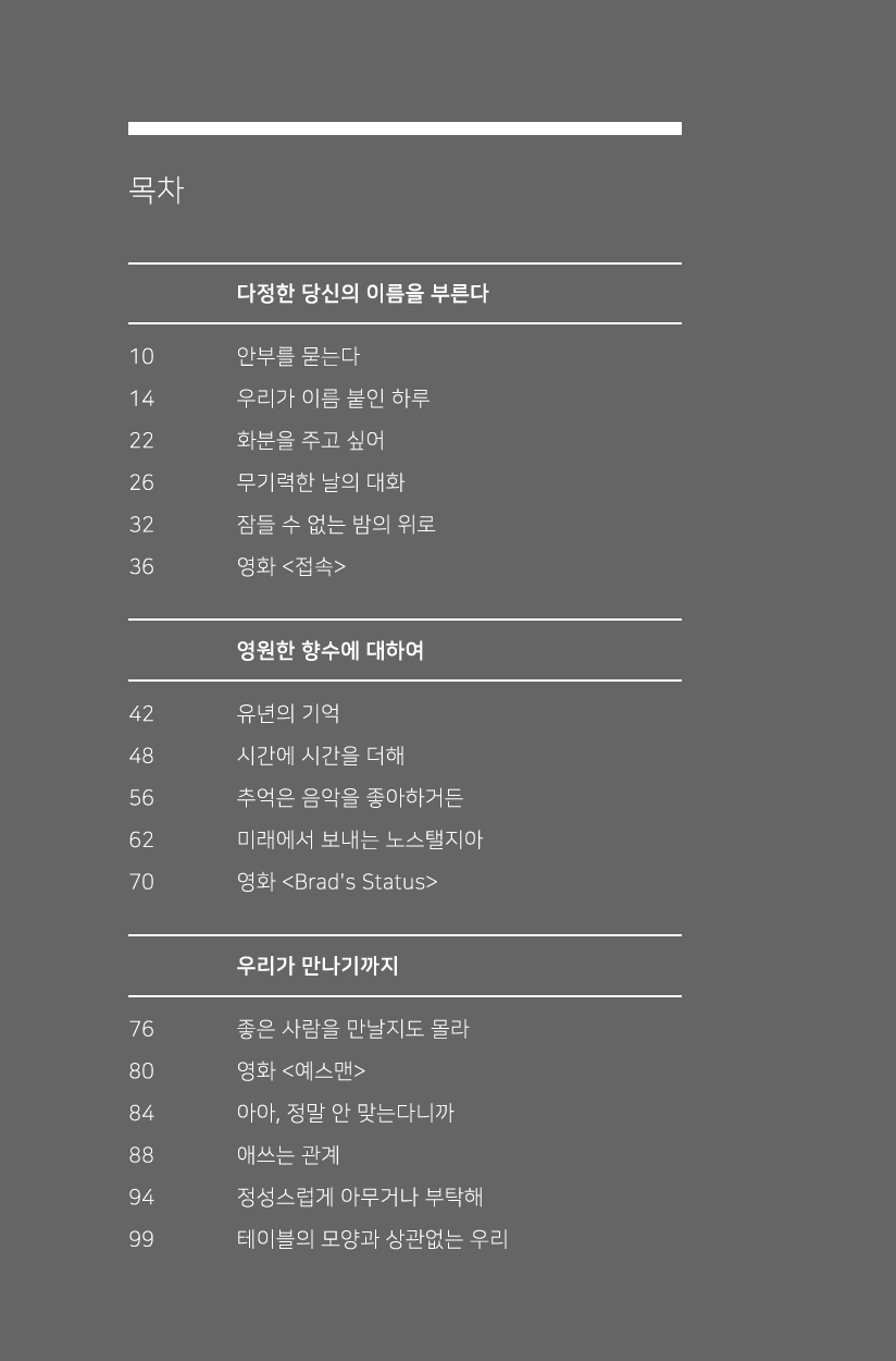 하루치 다정함을 채워줄 좋은 사람, 만남, 대화를 글 뭉치에 담았습니다.