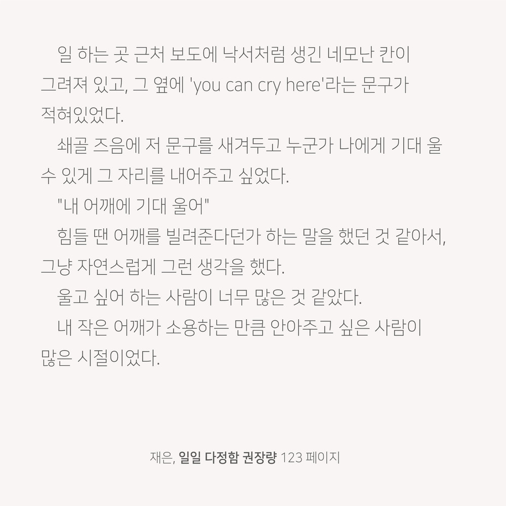 쇄골 즈음에 저 문구를 새겨두고 누군가 나에게 기대 울 수 있게 그 자리를 내어주고 싶었다.