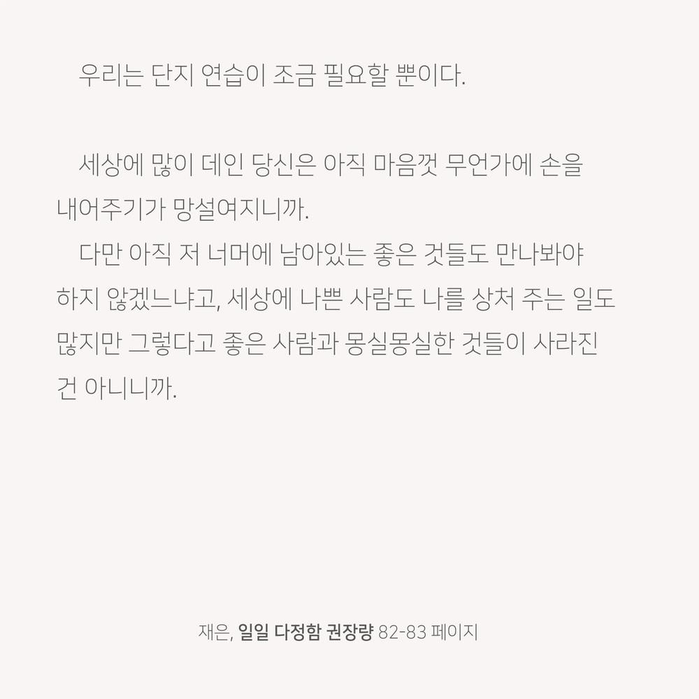 세상에 많이 데인 당신은 아직 마음껏 무언가에 손을 내어주기가 망설여지니까.