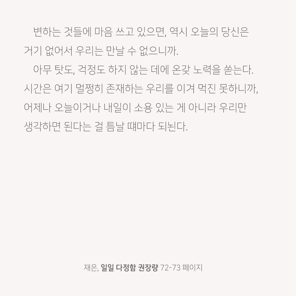 아무 탓도, 걱정도 하지 않는 데에 온갖 노력을 쏟는다. 시간은 여기 멀쩡히 존재하는 우리를 이겨 먹진 못하니까,