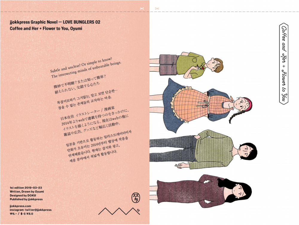 jjokkpress graphic novel - love bunglers 01~04 사랑에 서툴고, 때로는 그래서 사랑을 망치는, 그렇지만 끝끝내 사랑을 해나가는 사람들을 주제로 국내외 만화가들의 작업을 모았습니다. 금번 주제는 2019년 매 계절마다 다채로운 작가들의 이야기로 채워지고 이어질 예정입니다. info 01 발행일: 2019-03-23