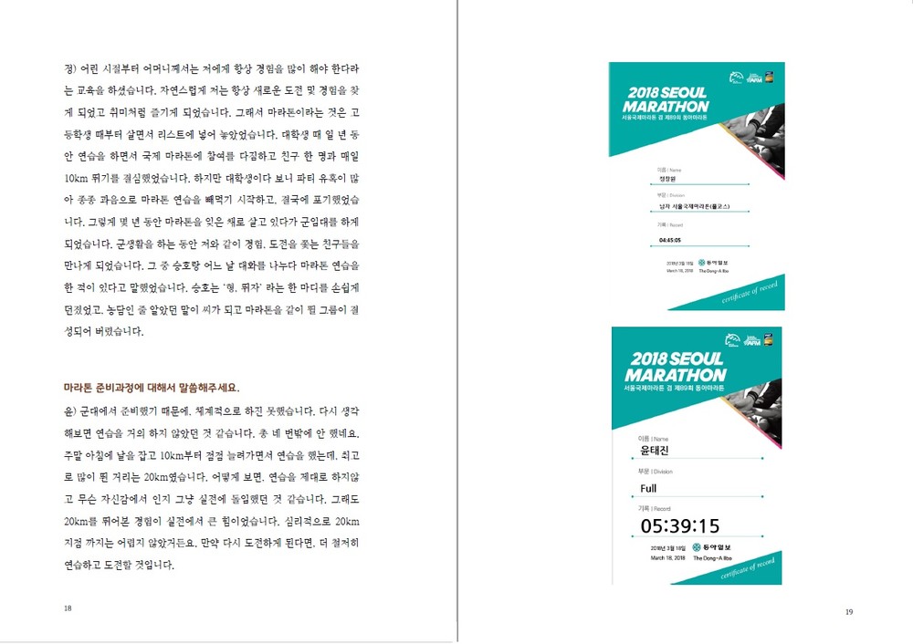 도전을 좋아하여 '서울 국제마라톤'에 참가, 4시간 45분만에 완주했다.
