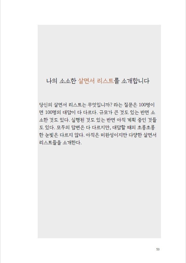 독자는 이 글을 읽으며 자신의 살면서 리스트(버킷 리스트)가 무엇인지 생각해볼 것이며,