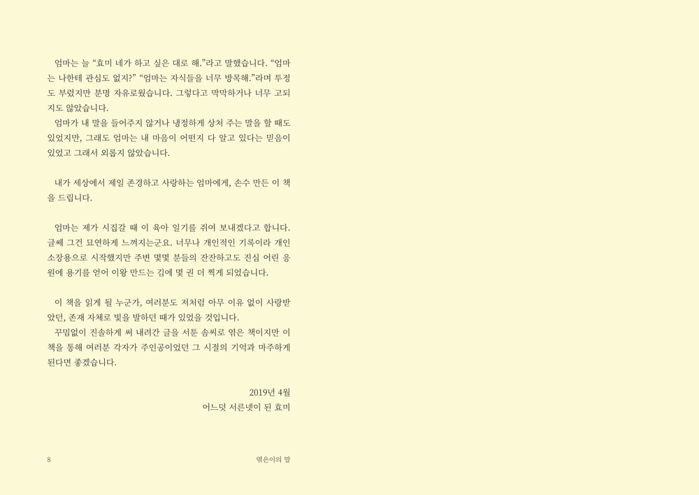 엮은이는 환갑이 지나 고등학교에 입학해 만학의 꿈을 이루고, 그 참에 대학 문예창작과에 입학한 엄마(글쓴이)를 응원하는 마음으로