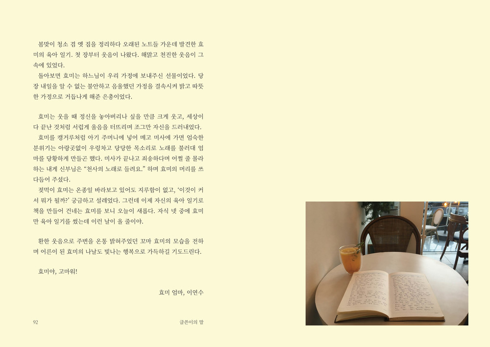 하는 거라고는 온종일 먹고, 자고, 싸고, 웃고, 울고 밖에 없는 주인공을 향한 엄마의 무한한 애정이 느껴지는 담백하고 진솔한 글을 읽다보면