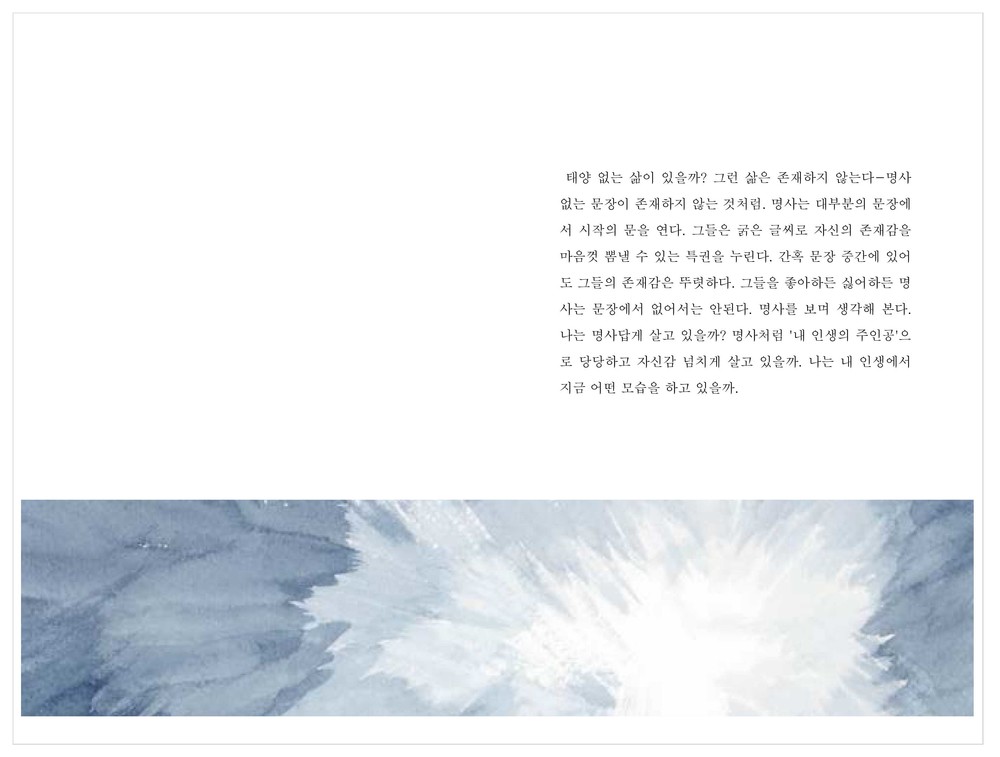 / 그들은 문장의 주인공으로서 언제나 반짝반짝 빛나는 주연을 맡는다. 하지만 만약 문장에서 명사가 없다면? 명사가 없다고 문장이 아니라고 할 수 있을까? 마찬가지로 어떤 삶 속에서 주인공이 없다고 삶이 아닌 것인가.