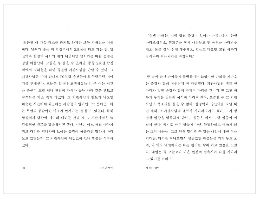 '영어'하면 떠오르는 것이 무엇인가요? 공부? 단어? 암기? 문법?....보통 영어 하면 떠오르는 것은 대부분 리스닝, 리딩 등 문제집이나 학습서 일 것입니다. 책 소개를 자세하게 이야기하기 전에 분명한 것은 이 책은 영어 학습서가 아닙니다. 지극히 사적인 에세이 입니다.