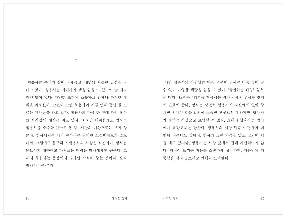 '관계'라는 것은 무엇일까요? 우리가 살고 있는 세상은 온통 '관계와 관계'의 연속입니다. 관계라는 것은 서로가 서로에게 영향을 주고받을 수 있는 말이나 어떤 행동들로 이루어진 것이 아닐까요. 말과 말, 언어와 언어, 문장과 문장.... 문장의 구조 속에서도 당연히 이 관계가 존재합니다. 명확하고 애매하지 않죠. 이 책은 그 중에서도 영어 문법 속의 단어들, 즉 각각의 품사들이 갖고 있는 의미와 관계들이 그들이 입고 있는 색의 전부가 아니라는 것을 이야기 합니다.