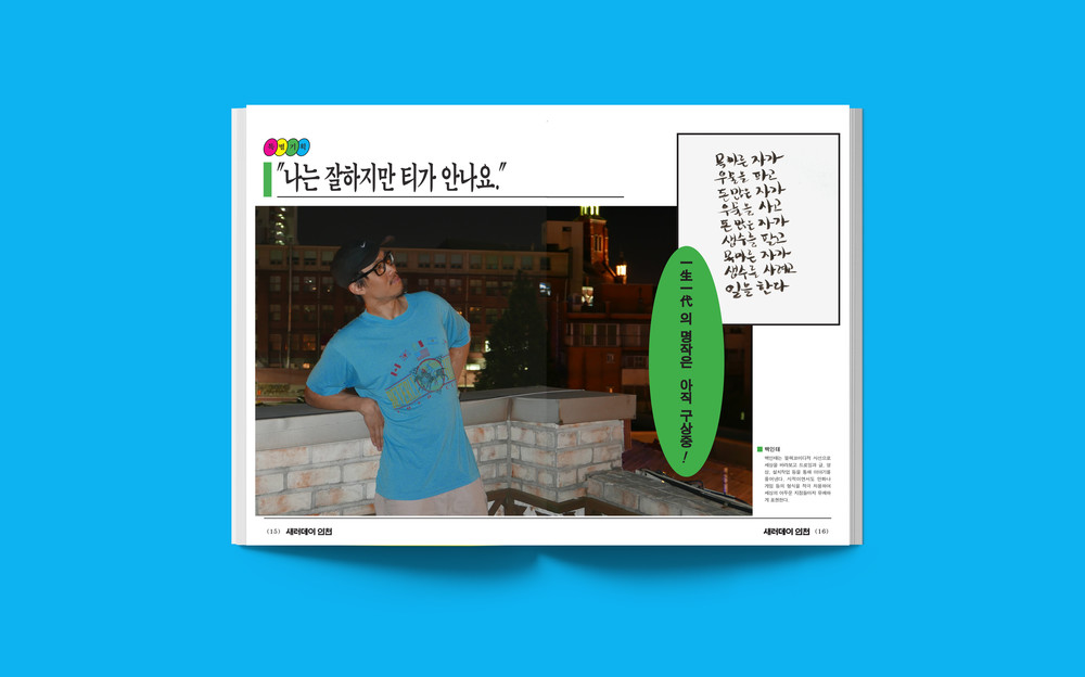 때로는 아주 작은 연예계 같기도, 놀이터같기도, 가십의 장 같기도 한 예술계, 그리고 현실을 사는 예술인들의 활동과 삶을 어떻게 보다 일상에 가까운 것으로 흥미롭게 전할 수 있을까 고민했습니다. 이에 <새러데이 인천>은 70-80년대 대중오락잡지 <선데이서울>을 벤치마킹하여 작가들의 활동을 소개하고, 신화화된 작가이미지를 그려내기보다는 삶을 살며 작업활동을 지속하는 작가들의 일상적 고민을 인터뷰를 통해 허심탄회하게 담아냈습니다.