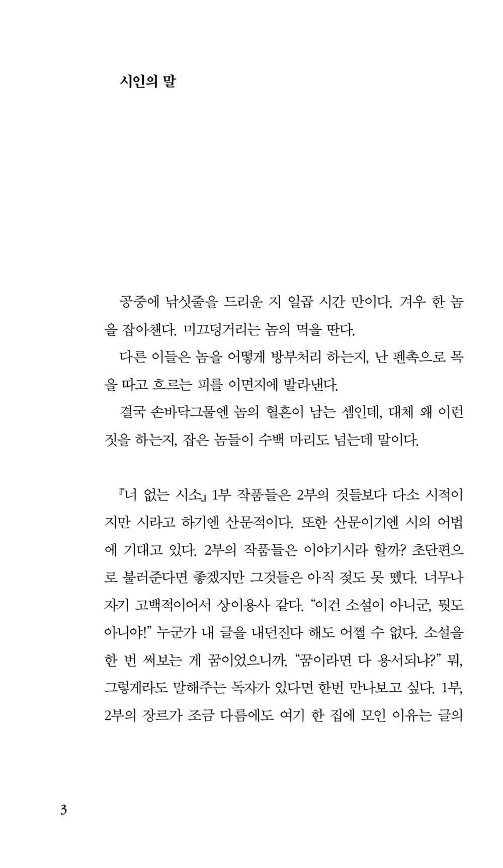 작가는 하나의 문제의식에서 출발한다. 시간, 그 난폭성 앞에서 인간은 과연 속수무책일 뿐인가. 죽음 너머를 알고 싶지만, 이 미션에서 성공한 사람은 없다. 그러나 이대로 주저앉을 것인가. 지금도 시간이란 괴물은 침을 질질 흘리는데. 빨리? 가진 거라곤 낡은 일상뿐인데? 일상을 넓게, 멀리, 높이, 깊게…. 열어보기로 시간과의 싸움을 시작한다. 하긴 그것밖에 할 일이 없기도 하다. 오늘을 사는 글쓰기를 통해 점점이 자라나는 죽음이란 구멍들을 설기얼기 꿰매보는 것! 따라서 그녀의 글쓰기는 쉬지 않고 이야기하려는 시도가 가득하다. 「시인의 말」을 직접 들어보자. “『너 없는 시소』 1부 작품들은 2부의 것들보다 다소 시적이지만 시라고 하기엔 산문적이다. 또한 산문이기엔 시의 어법에 기대고 있다. 2부의 작품들은 이야기시라 할까? 초단편으로 불러준다면 좋겠지만 그것들은 아직 젖도 못 뗐다. 너무나 자기 고백적이어서 상이용사 같다. “이건 소설이 아니군, 뭣도 아니야!” 누군가 내 글을 내던진다 해도 어쩔 수 없다. 소설을 한 번 써보는 게 꿈이었으니까. “꿈이라면 다 용서되냐?” 뭐, 그렇게라도 말해주는 독자가 있다면 한번 만나보고 싶다. 1부, 2부의 장르가 조금 다름에도 여기 한 집에 모인 이유는 글의 장르가 이도 저도 아닌 까닭도 있다. 굳이 또 다른 이유는 그것들이 하나의 물음을 향하고 있어서이다. 죽음 너머를 알고 싶다.“ 오늘이 주어진 삶의 전부일지도 모른다. 그런 오늘을 위해 누군가 무수하게 죽어갔다. 죽음이 일어나고 있는 오늘은 둥근 공 모양일까? 안도 밖도 없겠지? 누군가의 죽음에 빚을 져야 살 수 있는 이상한 삶의 방식, 그래서 오늘이 끝나가는 시간에도 글을 쓰고 병을 앓고 여행을 떠난다.