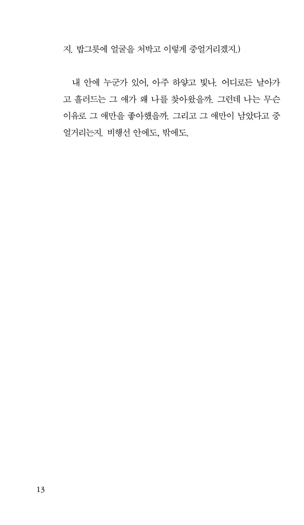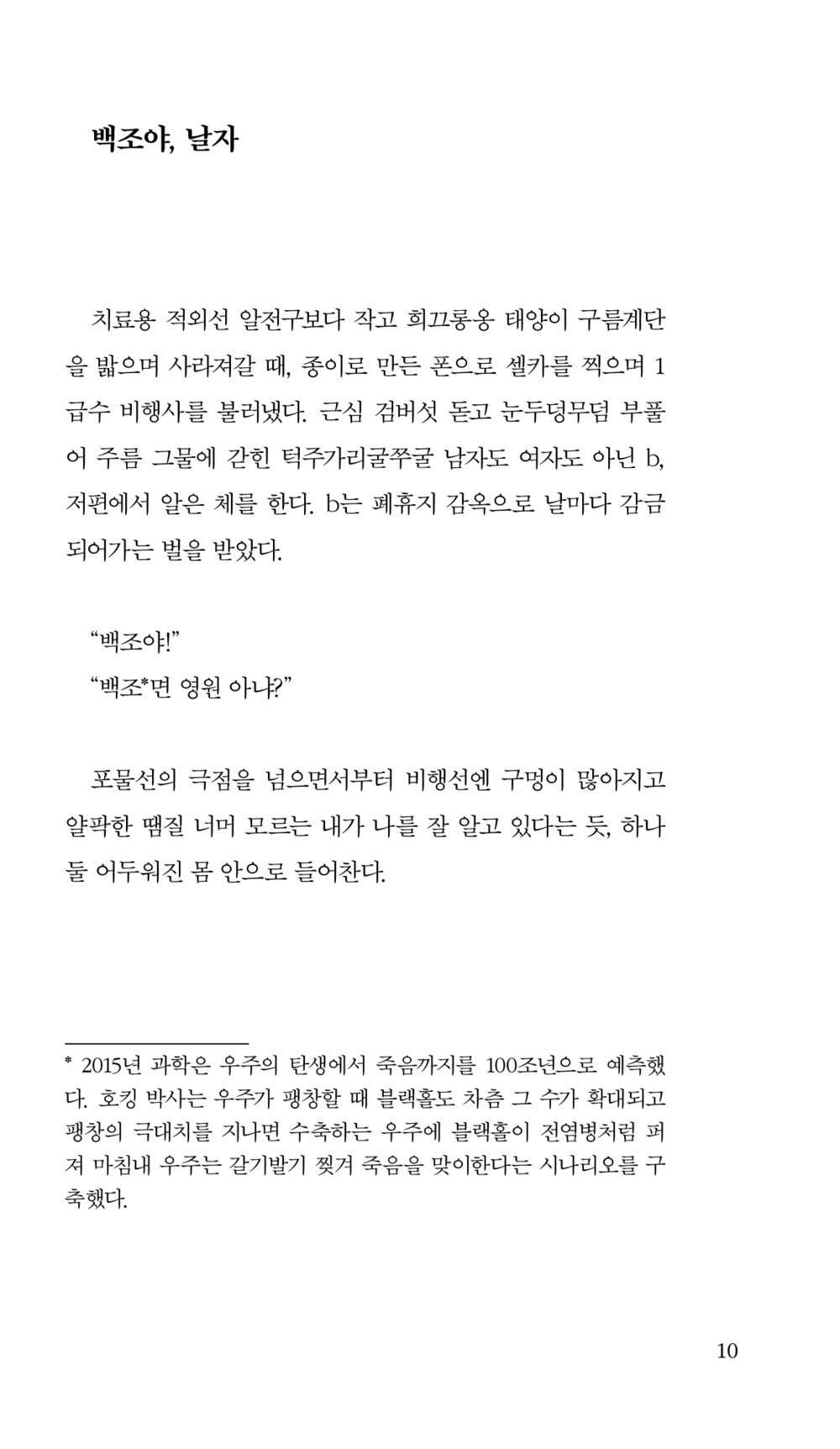 치료용 적외선 알전구보다 작고 희끄롱옹 태양이 구름계단을 밟으며 사라져갈 때, 종이로 만든 폰으로 셀카를 찍으며 1급수 비행사를 불러냈다. 근심 검버섯 돋고 눈두덩무덤 부풀어 주름 그물에 갇힌 턱주가리굴쭈굴 남자도 여자도 아닌 b, 저편에서 알은 체를 한다. b는 폐휴지 감옥으로 날마다 감금되어가는 벌을 받았다.