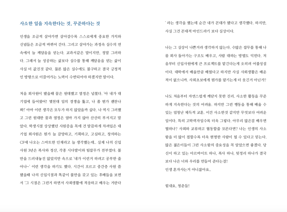 여전히 엄청난 결과물이나 보여지는 화려함은 없지만 늘 노력하는 삶을 살아가고 싶다는 저자는