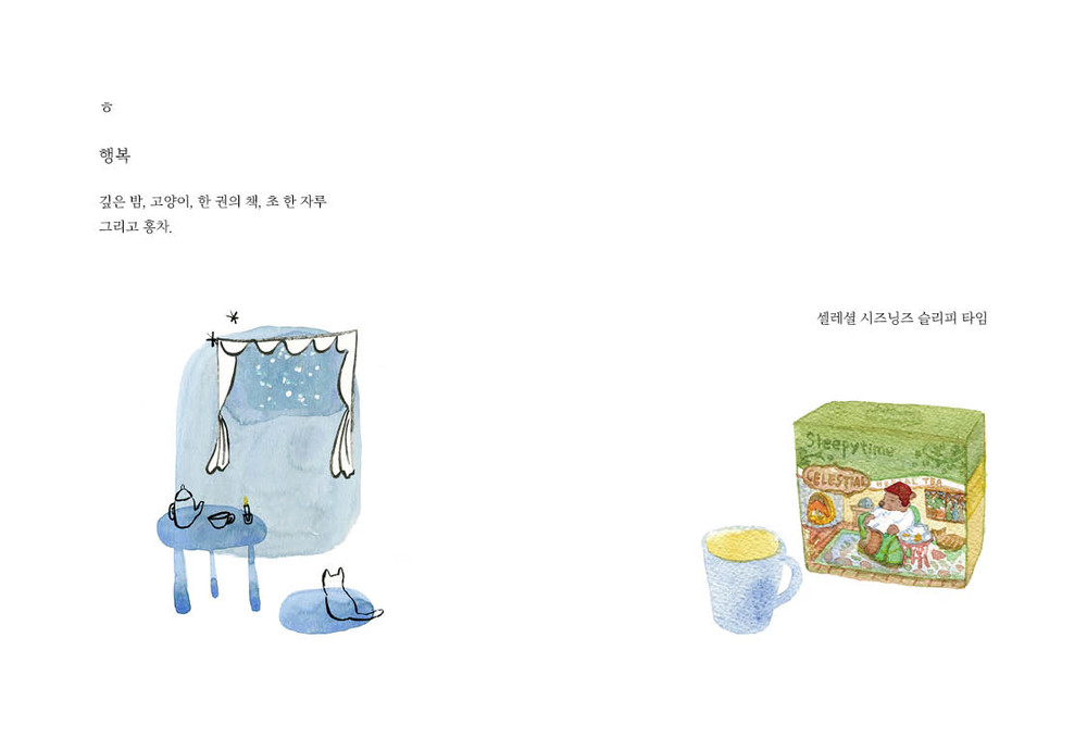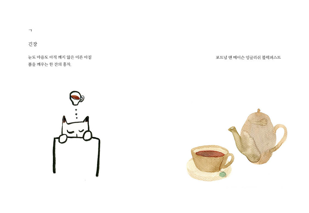 따듯한 수채화와 굵은 먹선의 조화가 이루는 휴식 같은 그림들과 홍차와 허브차에 대한 기본 정보.
