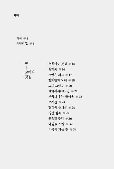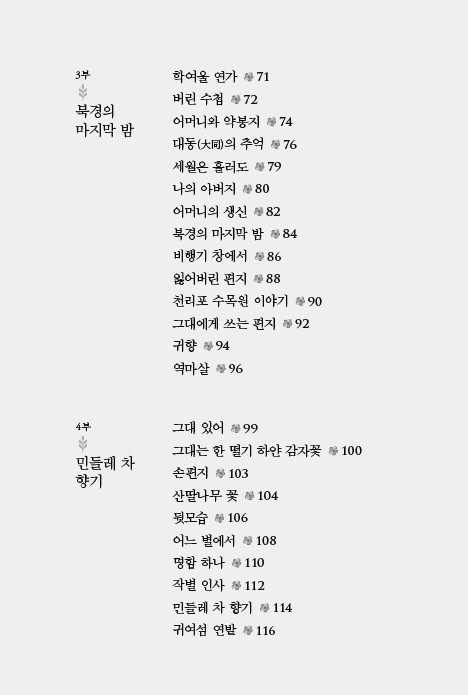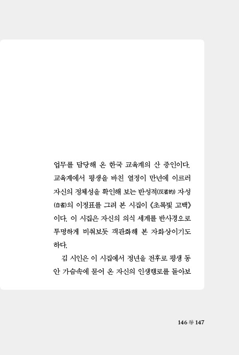 인생 만년에 이르러 자신의 정체성을 확인해 보는 반성적(反省的) 자성(自省)의 이정표를 그려 본 시집. 삶의 진솔함과 원숙함을 시 속에서 느낄 수 있다.
